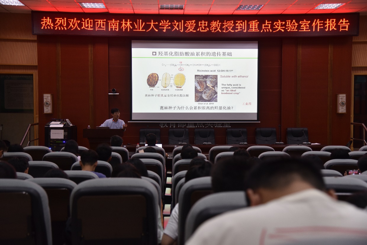 刘爱忠教授长期从事重要木本油料植物种质资源的发掘、分子遗传与育种应用研究,在相关领域有着丰硕的成果,在国内外同类领域具有广泛影响。本次报告会,刘老师以“植物种子特殊脂肪酸油累积的遗传机理”为题,介绍了油料种子在发育过程中累积特殊脂肪酸的遗传机理。
