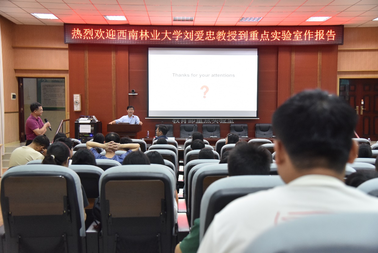 2024年6月14日,西南林业大学刘爱忠教授应邀到我院作学术报告。本次报告会是我院组织召开的“漓江生态与保护论坛”系列学术报告活动之一。我院院长武正军教授主持报告会,师生90余人参会。