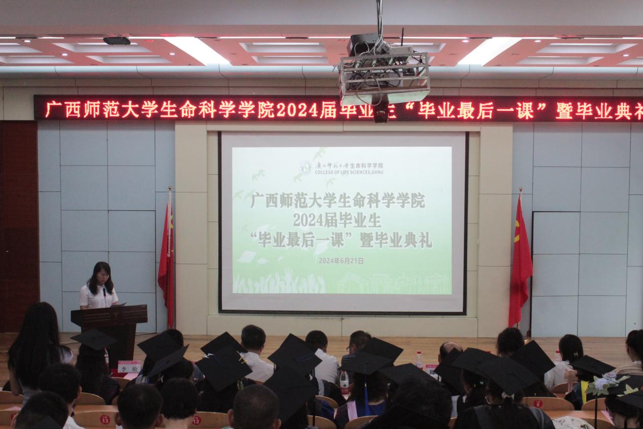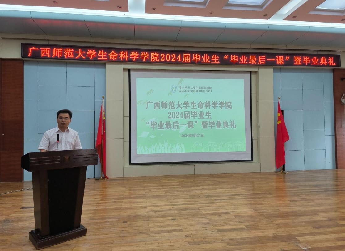 6月21日下午,生命科学学院2024届毕业生“毕业最后一课”暨毕业典礼在雁山校区大学生学术报告厅举行。学院领导班子、教师代表、全体专兼职辅导员、2024届毕业生及家长代表共200余人参加典礼。毕业典礼由学院党委副书记主持。