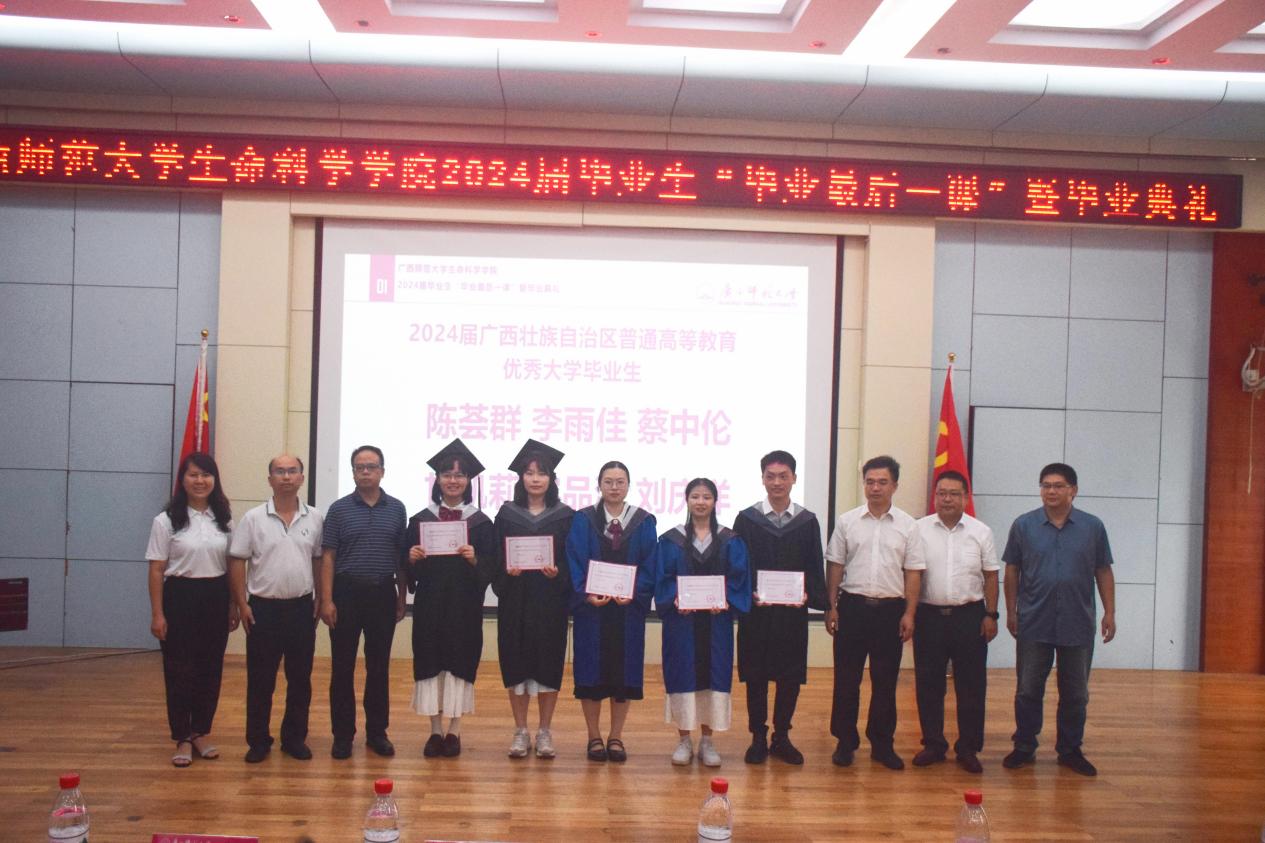 毕业典礼上,学院院长为全体毕业生上了一堂“启航新征程,共绘青春华章”为主题的“毕业最后一课”。他代表学院向全院410名本科生和研究生毕业生们顺利毕业表示祝贺,并从志存高远、奋进前行、锐意创新、涵养心境四个方面对毕业生给予殷殷嘱托,希望同学们以奋斗姿态激扬青春,逐梦新时代担复兴大任,励志创未来做时代新人,不负韶华,创造无愧于时代的精彩人生。学院党委副书记宣读学院2024届广西壮族自治区普通高等教育优秀毕业生名单,学院领导班子成员和教师代表为获奖者颁发荣誉证书。
