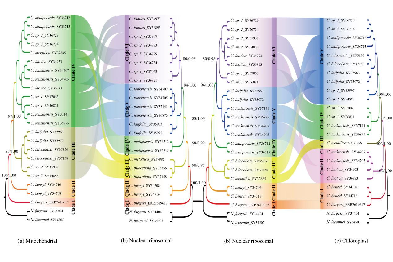 课题组首次测序和组装了小花檬果樟(C. henryi)完整的线粒体基因组(mtDNA)、叶绿体基因组(cpDNA)和核糖体顺反子(nrDNA)序列,长度分别为1,168,029 bp, 154,938 bp和6495 bp。在小花檬果樟的线粒体基因组中,共发现了2,233个重复序列和368个简单重复序列。其线粒体基因组与叶绿体基因组之间检测到50个同源DNA片段,暗示细胞器基因组之间存在遗传信息的交流。基因同线性分析显示,望春玉兰(Magnolia biondii)、莲叶桐(Hernandia nymphaeifolia)和小花檬果樟之间存在大量线粒体基因重排现象,三者仅发现了6个保守的基因簇。基于mtDNA、cpDNA和nrDNA三个基因组序列矩阵重建的系统发育树结果显示,22个檬果樟分别聚为4、5和6个组。系统发育树之间存在显著的核质冲突,暗示同域分布模式影响檬果樟物种间的杂交、不完全谱系分选和质体捕获的发生,使得檬果樟树种在分化过程中形成了系统发育关系复杂的复合体。