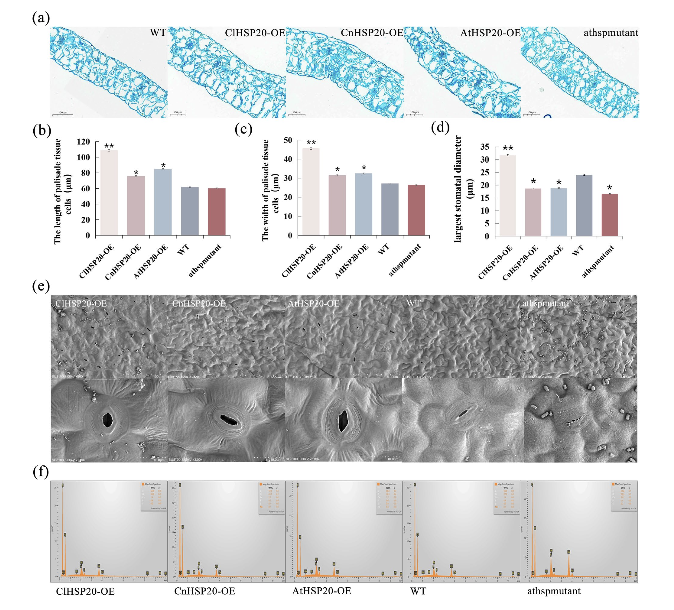 研究结果显示,在高钙胁迫下,超表达柠檬黄金花茶HSP20基因的株系在叶绿素、氮、含水量和湿度均增加。能谱扫描显示,超表达柠檬黄金花茶HSP20基因株系的叶片表面钙含量相对较低,而突变体株系的叶片表面高含量最高。ClHSP20基因还能影响土壤湿度和土壤氮、磷、钾的含量。与普通金花茶的HSP20基因表达株系相比,ClHSP20-OE株系中的FBA5和AT5G10770的表达显著上调。与突变株系相比,AtHSP20-OE株系中的DREB1A和AT3G30460的表达量显著上调,POL表达量下调。本研究为后期对植物应对岩溶高钙环境胁迫的相应研究提供参考以及填补对金花茶中HSP20基因研究的空缺。
