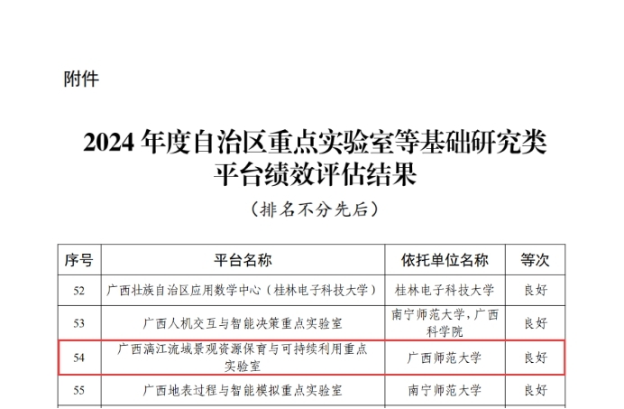 7月15日,自治区科技厅公布2024年度自治区重点实验室等基础研究类平台绩效评估结果,广西漓江流域景观资源保育与可持续利用重点实验室绩效评估获良好等次。