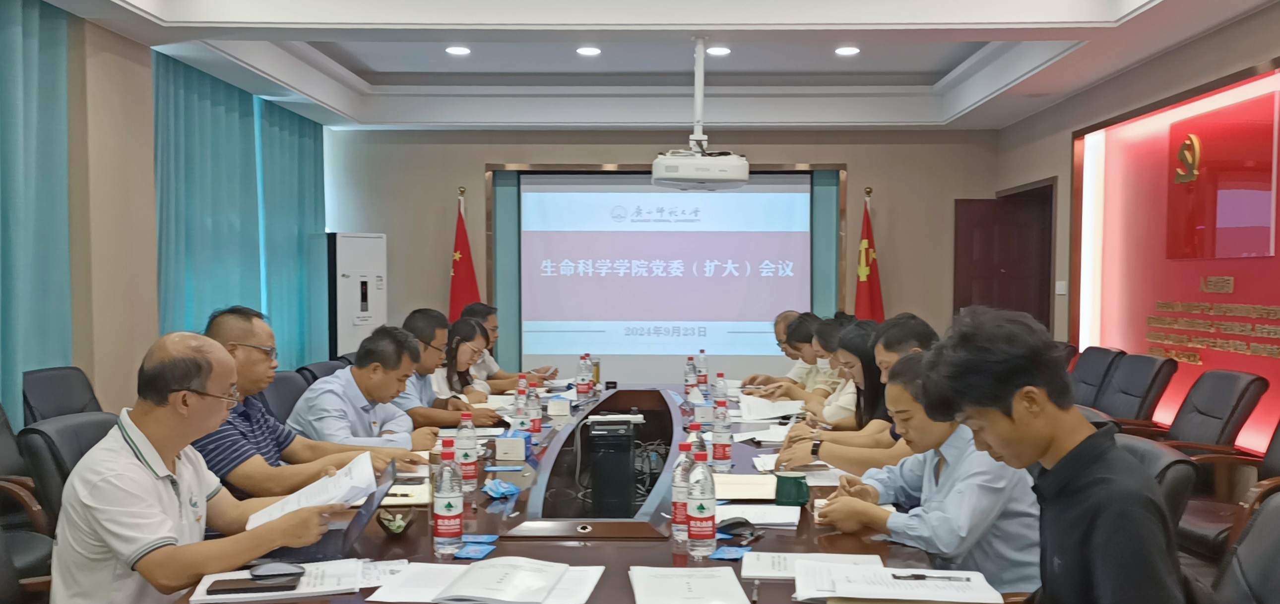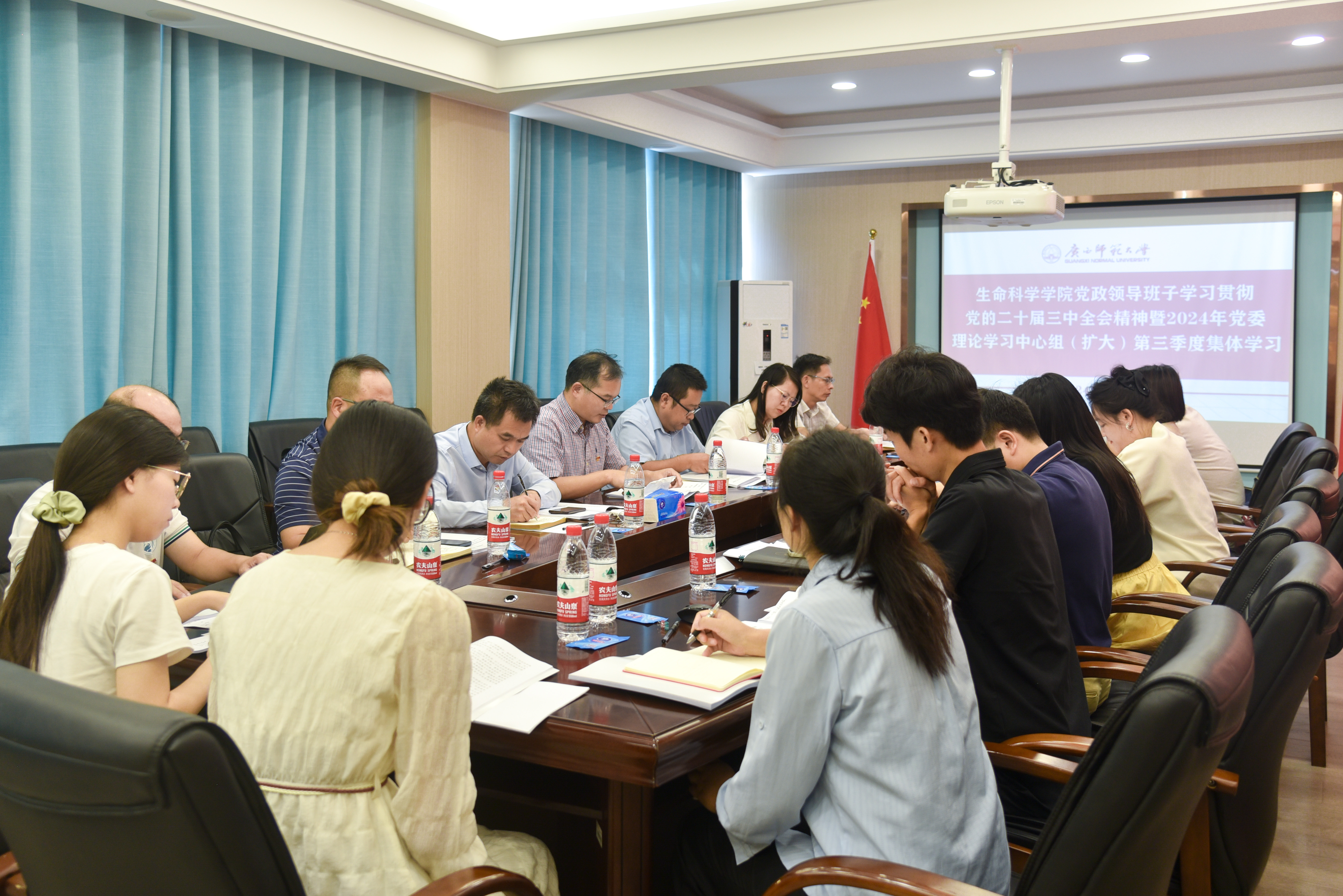 9月23日上午,生命科学学院党委在雁山校区理科组团224室组织召开学院党政领导班子学习贯彻党的二十届三中全会精神暨2024年党委理论学习中心组(扩大)第三季度集体学习会议。会议深入学习贯彻党的二十届三中全会精神,解放思想、深化改革,以强有力的行动推进学院实现特色发展、创新发展、高质量发展。