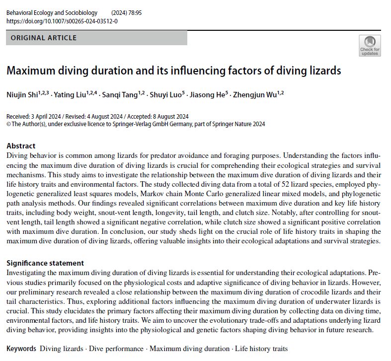 该成果以题“Maximum diving duration and its influencing factors of diving lizards”于2024年8月24日发表在国际学术期刊《Behavioral Ecology and Sociobiology》(中科院二区,JCR一区)上。广西师范大学(珍稀濒危动植物生态与环境保护教育部重点实验室)为第一署名单位,2023级博士研究生师牛津与2019级硕士研究生刘亚婷为论文共同第一作者,武正军教授为论文通讯作者,广西师范大学唐三淇老师,广西大桂山鳄蜥国家级自然保护区罗树毅、何家松参与了该研究工作。研究得到了国家自然科学基金(32160131)的资助。文章链接:https://doi.org/10.1007/s00265-024-03512-0。