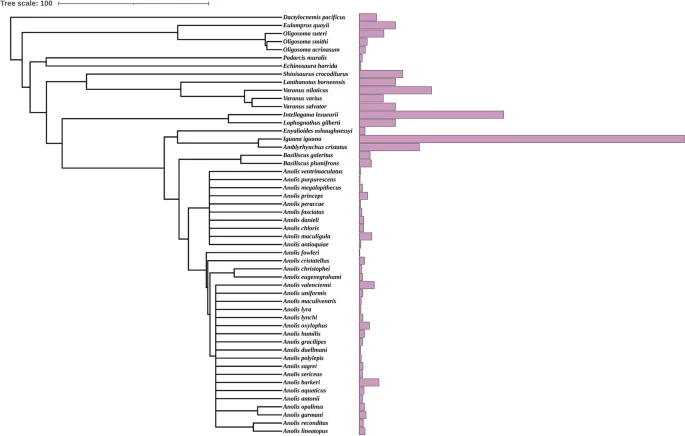 图3. 潜水蜥蜴系统发育树中最长潜水时间的分布