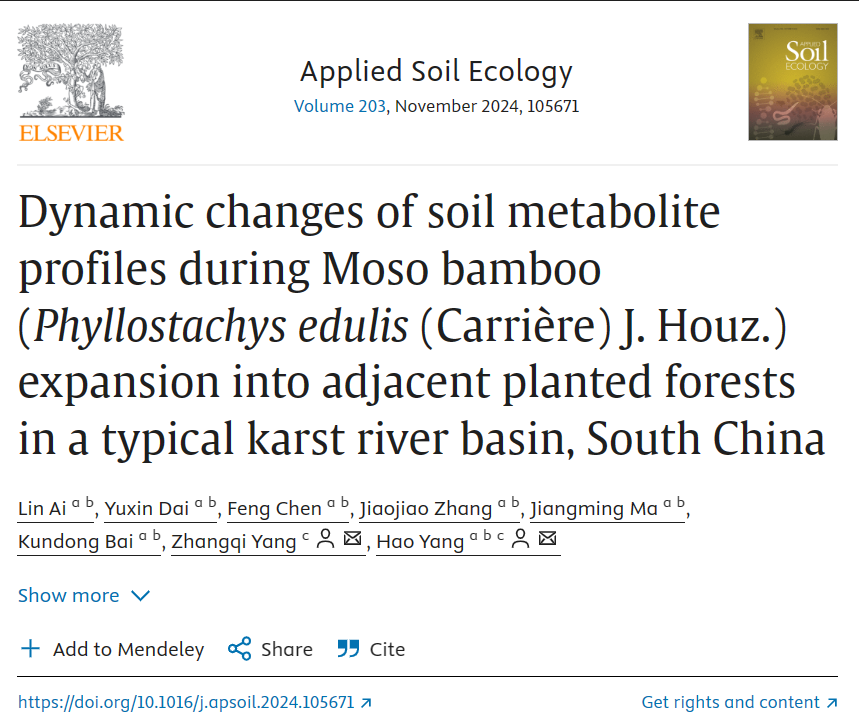 2024年10月9日,相关研究结果以“Dynamic changes of soil metabolite profiles during Moso bamboo (Phyllostachys edulis (Carrière) J. Houz.) expansion into adjacent planted forests in a typical karst river basin, South China”在土壤生态学权威期刊Applied Soil Ecology(JCR1区, 中科院二区TOP期刊, IF=4.8)发表。论文第一单位为广西师范大学珍稀濒危动植物生态与环境保护教育部重点实验室,2022级生态学研究生艾林为论文第一作者,我院马姜明教授、白坤栋教授也参与了本次研究,杨皓博士和杨章旗教授为共同通讯作者。该研究获得了国家自然科学基金 (31960241),广西科技基地和人才专项 (桂科AD19254004),八桂学者专项 (2019A26) 的资助。