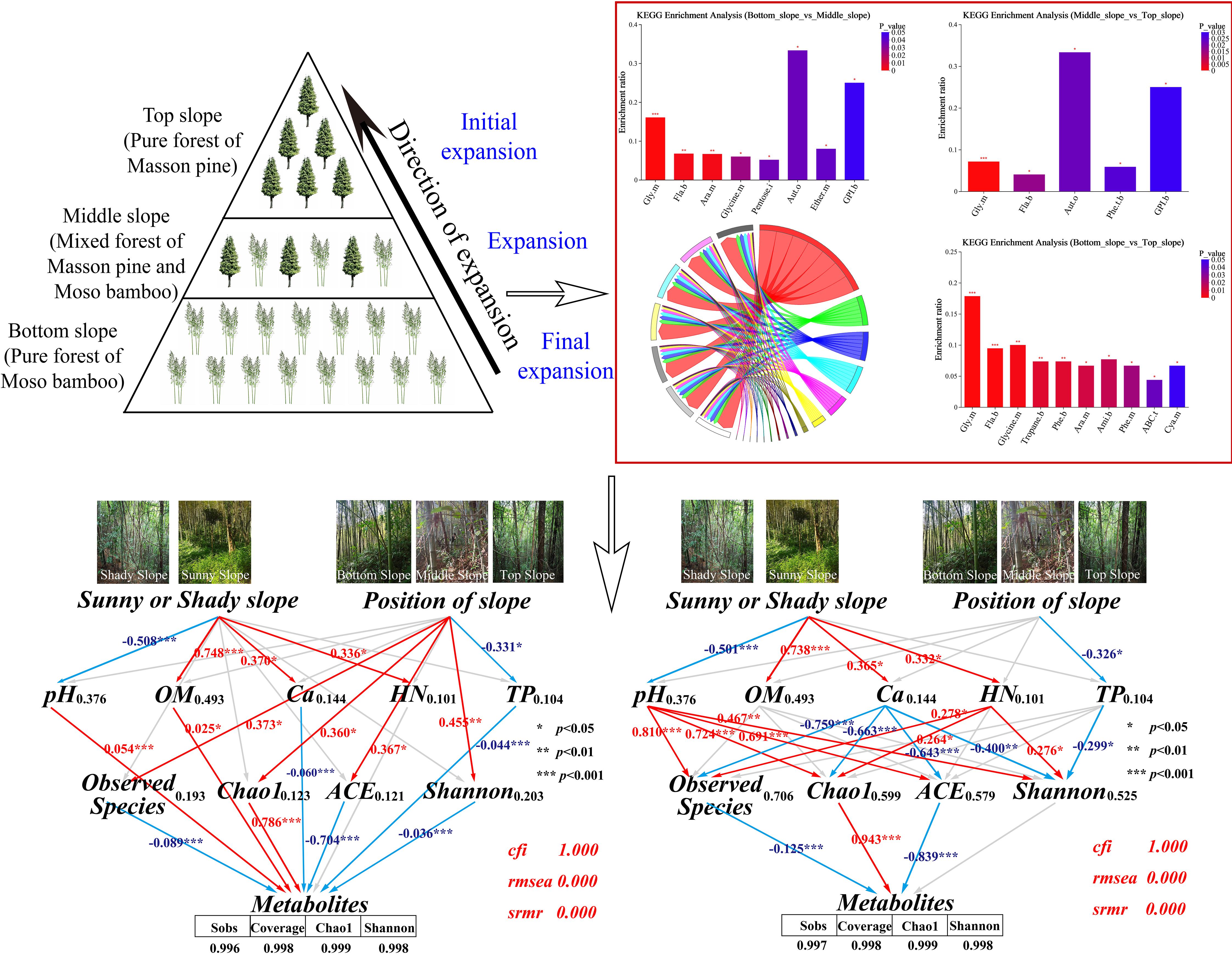 毛竹 (Phyllostachys edulis (Carrière) J. Houz.) 广泛种植于亚热带地区,具有强大的克隆繁殖能力,极易向邻近森林群落扩张。以前关于毛竹扩张的研究主要集中在天然林上,而对人工林,特别是对邻近针叶林影响的研究有限。本研究基于土壤代谢组学研究,探讨了毛竹向马尾松人工林扩张的影响,在典型喀斯特河流域的不同坡向和坡位下进行分析,阐明其与土壤代谢产物和环境因子的关系。结果表明,毛竹扩张影响了土壤中甘油磷脂代谢和类黄酮生物合成,其土壤代谢产物的alpha多样性随扩张的推进而显著降低。土壤有机质、全磷和土壤微生物群落组成对土壤代谢产物的影响显著。此外,坡位和坡向对土壤代谢产物的影响存在两条潜在影响路径:坡位与坡向通过土壤理化性质与微生物群落共同影响土壤代谢产物;坡位与坡向直接影响土壤理化性质,再通过土壤微生物群落的介导作用影响土壤代谢产物。研究首次从土壤代谢组学的角度分析了毛竹扩张的机制,强调了土壤代谢产物在快速响应植被覆盖动态中的作用,揭示了其与环境因子之间的耦合关系,为了解漓江流域毛竹扩张机制以及潜在入侵植物对森林生态系统的生态风险提供新的思考。