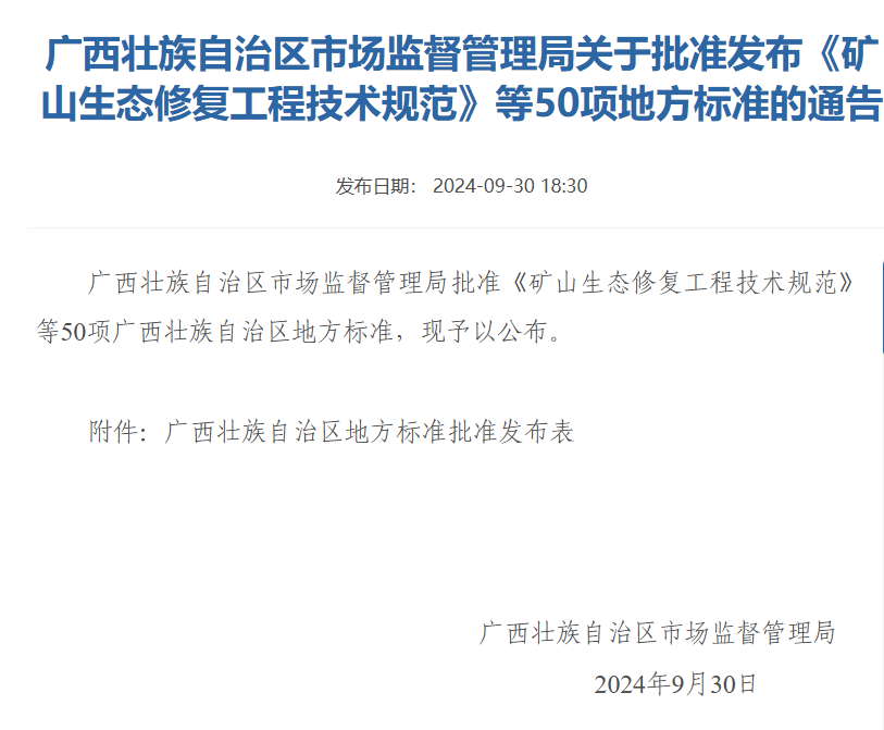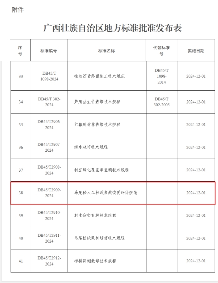 近日,我院马姜明教授课题组牵头编制的广西壮族自治区地方标准《马尾松人工林近自然恢复评价规范》获广西壮族自治区市场监督管理局批准发布。该标准是由自治区林业局提出并归口,广西师范大学牵头编制,广西壮族自治区林业科学研究院、中国地质科学院岩溶地质研究所、桂林理工大学、横州市镇龙林场共同参与编制,将于2024年12月1日起实施。该标准的制定规范了马尾松人工林近自然恢复评价指标和方法,根据马尾松人工林近自然恢复状态,提出加速马尾松人工林向着近自然方向发展的对策,对推动广西马尾松人工林多目标、近自然经营具有指导意义。