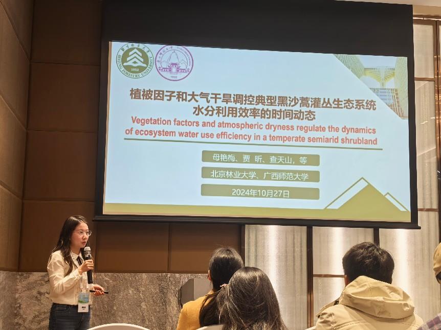 我院母艳梅、杨皓老师一行12人参加了此次大会。母艳梅老师、杨皓老师分别以《植被因子和大气干旱影响了典型黑沙蒿灌丛生态系统水分利用效率的时间动态》《喀斯特天坑内外樟科植物性状差异的主导因素研究:系统发育关系还是环境影响?》进行专题报告;2023级生态学硕士张娇娇、利倚婷在研究生论坛进行了口头报告;2024级林业硕士汪禹彤、杨佳鑫、孙同方分别作了墙报展示。