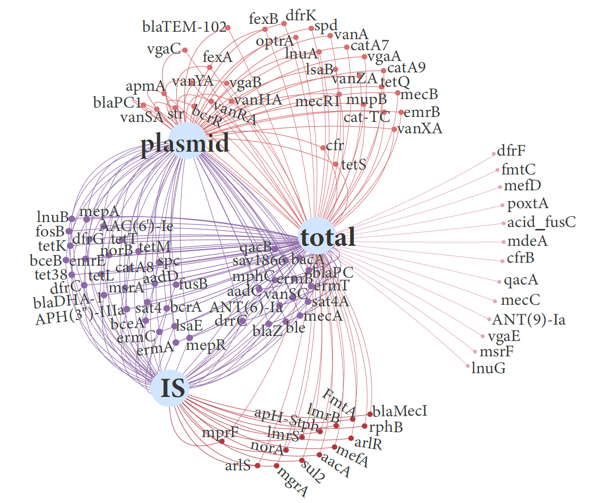 在金黄色葡萄球菌的研究中,课题组利用来自NCBI数据库的113,842个基因组序列,全面分析了其抗生素抗性基因的分布与多样性。结果表明,约84%的金黄色葡萄球菌基因组携带至少一种抗性基因,共识别出389,464条抗性基因序列,涵盖了19个主要类型和103个亚型。尤其在临床病例中,针对氟喹诺酮类、广谱抗药性、杆菌素类、四环素类、β-内酰胺类和氨基糖苷类的抗性基因尤为丰富,抗性基因的丰度范围从每百万碱基3.16×10-5至1.49次不等。研究还发现,中低收入国家的抗性基因丰度较高,但其多样性较低,而高收入国家则表现出较高的抗性基因多样性。此外,随时间推移,抗性基因的丰度有所下降,但多样性逐渐增加,反映出金黄色葡萄球菌抗性机制的演化。研究还探讨了移动遗传元件(MGEs)在抗性基因传播中的作用,结果显示,许多抗性基因亚型与质粒和插入序列元素相关,提示这些基因在不同国家之间的传播潜力。