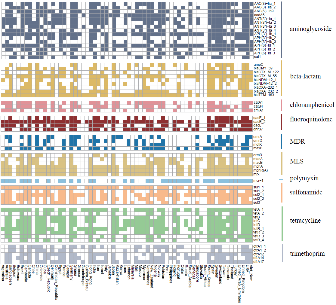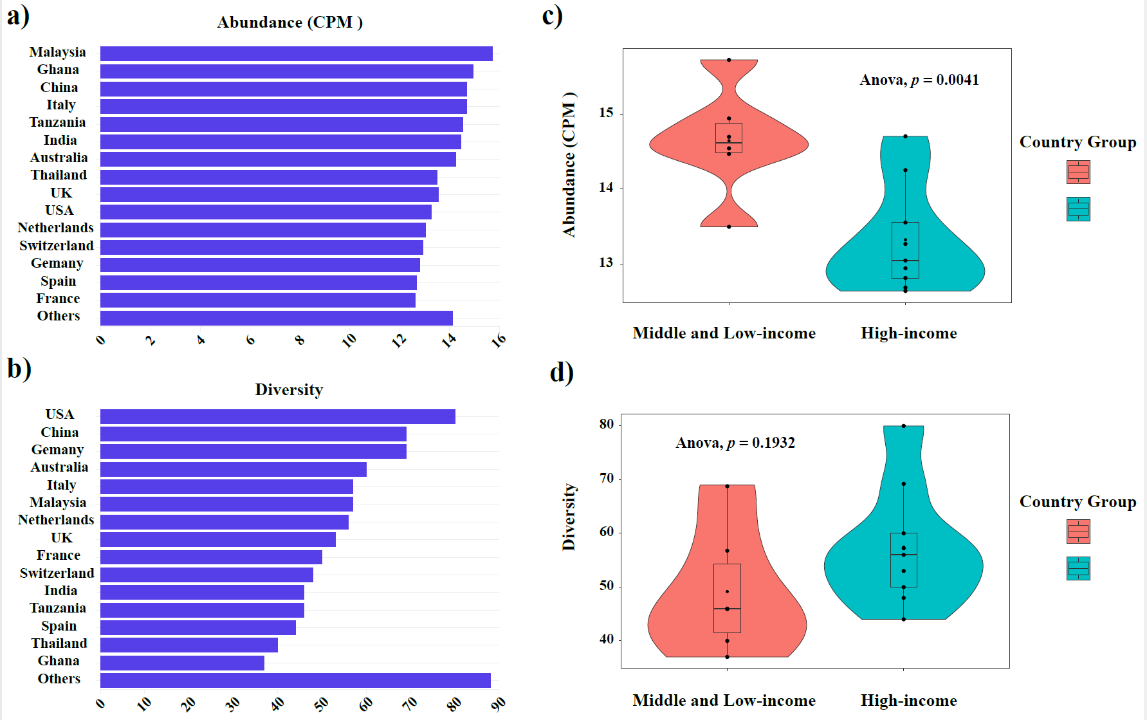 图1 不同国家中金黄色葡萄球菌抗性基因丰度和多样性的比较分析