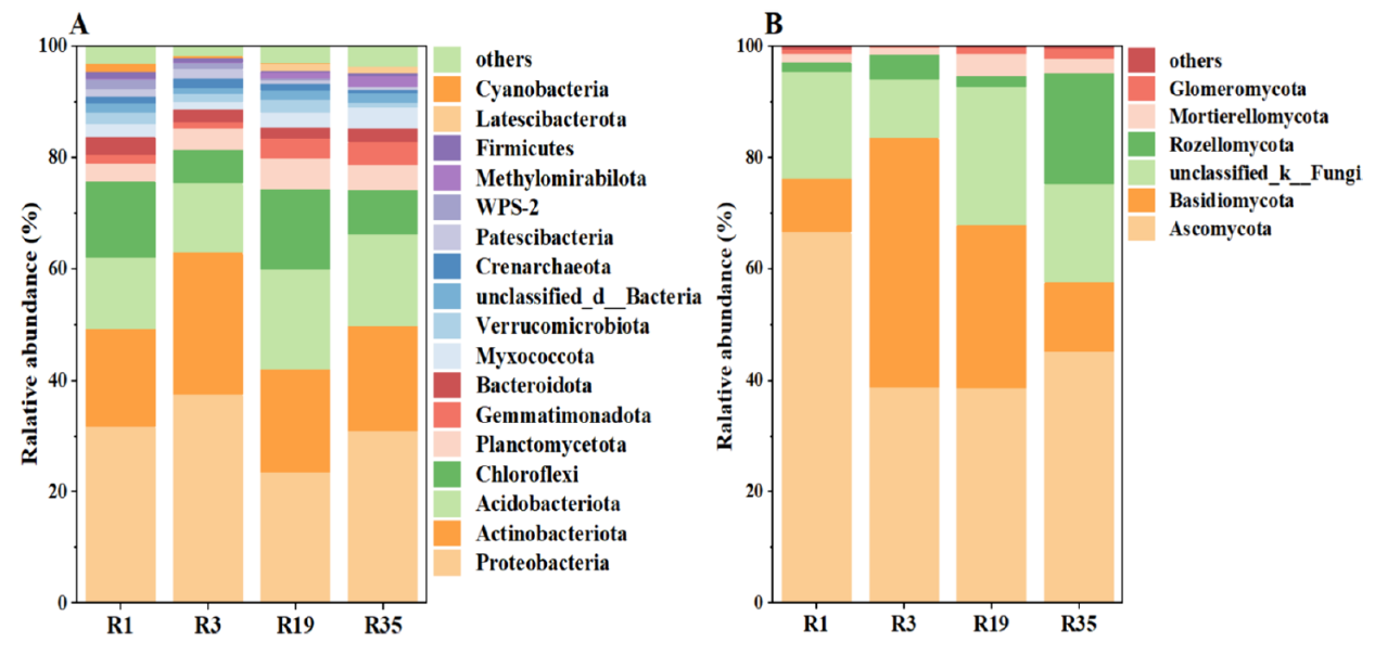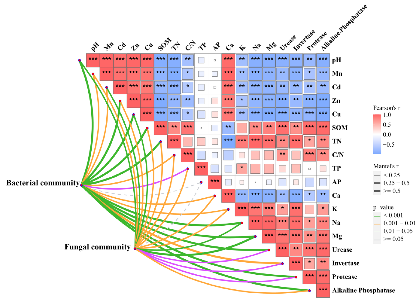 研究显示,在自然恢复的中后期阶段(R19和R35),土壤中重金属锰(Mn)、镉(Cd)、锌(Zn)和铜(Cu)的浓度显著降低,分别减少了80.4–85.3%、55.3–70.0%、21.0–38.1%和29.4–49.4%。同时,土壤细菌和真菌群落的α多样性显著提升,展现出随着恢复进程,土壤微生物多样性和生态系统功能逐步恢复的趋势。微生物群落结构的变化中,细菌的变化尤为显著,优势菌群如变形菌门(Proteobacteria)、放线菌门(Actinobacteria)和酸杆菌门(Acidobacteriota)呈现明显的动态演替,Rhizobiales、Burkholderiales和Hypocreales等菌群的相对丰度逐渐增加。共现网络分析显示,细菌间的相互作用随恢复时间增强,而细菌与真菌间的相互作用减弱,反映出微生物群落结构的复杂性随时间推移而变化。进一步的Mantel检验和偏最小二乘路径模型(PLS-PM)分析指出,土壤pH、重金属浓度(Mn、Cd、Zn、Cu)以及有机质(SOM)和全氮(TN)是驱动微生物群落组成变化的关键因素。其中,细菌群落对这些环境因子的响应强于真菌,展现了不同微生物类群在自然恢复过程中对环境变化的不同适应机制。