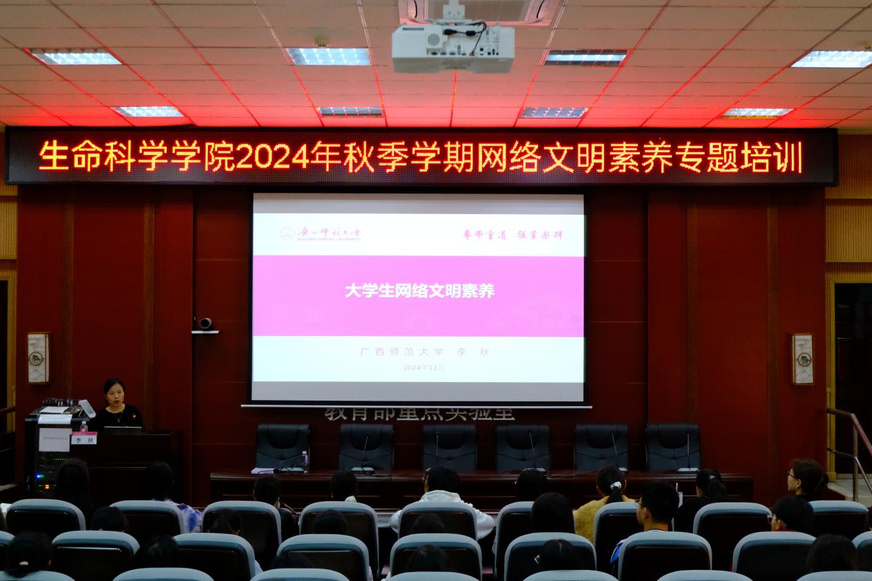 为提升大学生网络素养,引导广大青年学生依法用网、文明用网、健康用网,推动形成清朗的校园网络生态,11月19日下午,生命科学学院在伯康楼112报告厅成功举办2024年秋季学期网络文明素养专题培训。培训邀请学校党委宣传部李秋老师主讲,学院分管学生工作负责人、全体专兼职辅导员、新媒中心全体成员及各班宣传委员参加培训。