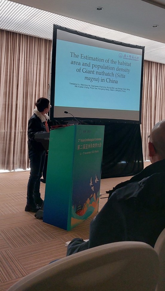 我院戴传银教授、张明霞副教授、马艳菊副教授一行三人参加了本次大会。其中,张明霞副教授受邀作以“The Estimation of the habitat area and population size of Giant Nuthatch (Sitta magna) in China.”为主题的学术报告;马艳菊副教授受邀作以“Mercury distribution in five populations of Siberian ruby throats (Calliope calliope) with different migration routes.”和“Mercury contamination the invisible threat to declining migratory shorebirds along the East Asian-Australasian Flyway.”为主题的学术报告,展示了我院在鸟类学研究领域的重要进展和创新成果。