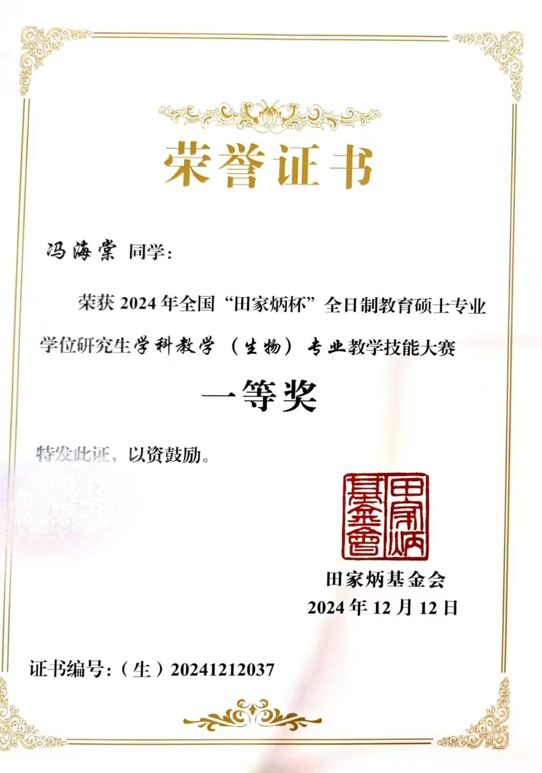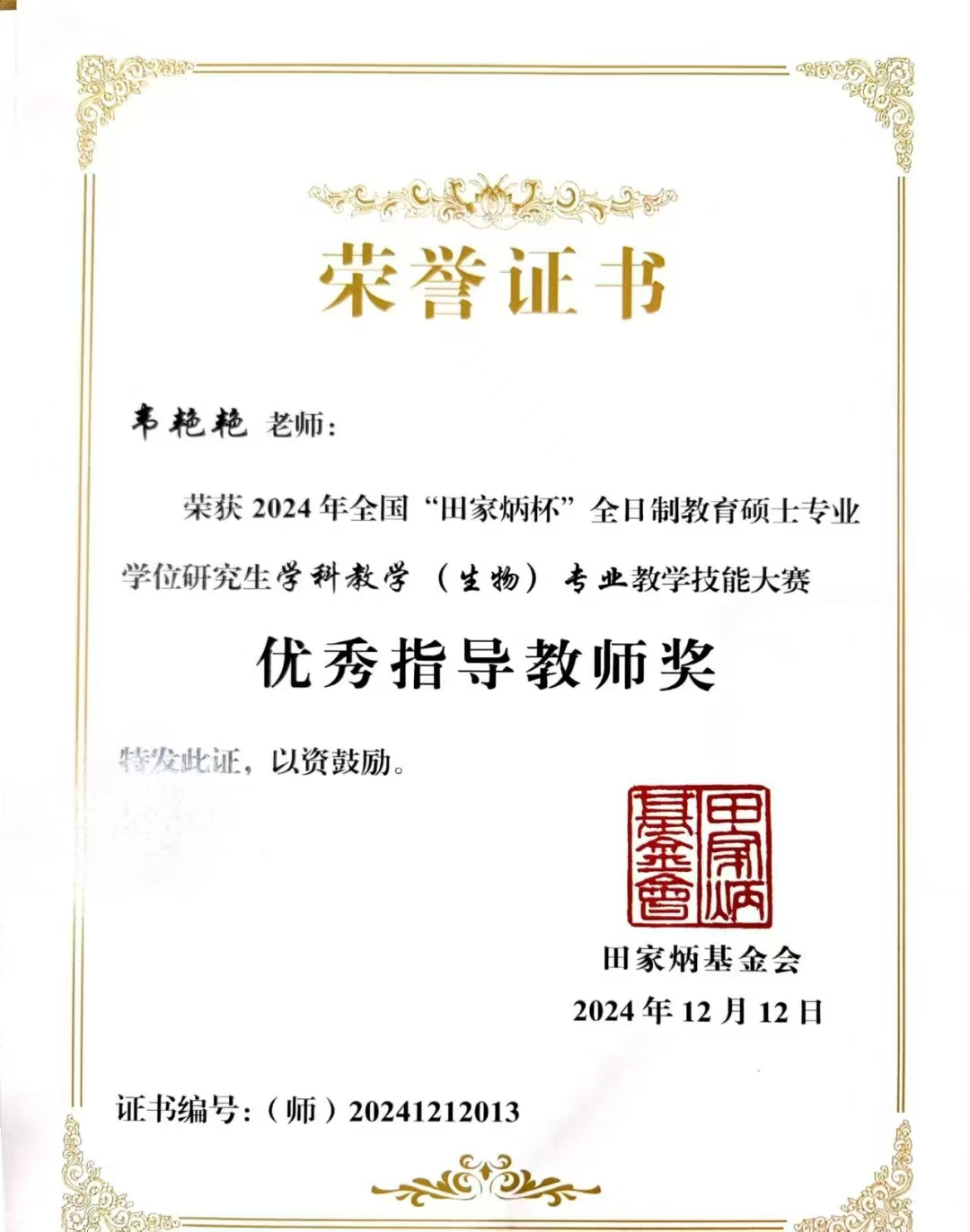 在2024年全国“田家炳杯”全日制教育硕士专业学位研究生学科教学(生物)专业教学技能大赛中,我院2023级学科教学(生物)专业研究生冯海棠在指导老师韦艳艳耐心的指导和专业的建议下,表现出色,一路过关斩将,最终荣获一等奖,实现了我院在该项一类竞赛中的历史性突破。而指导老师韦艳艳也凭借其专业、细致且全面的指导工作,获得此次大赛的“优秀指导老师”荣誉称号。