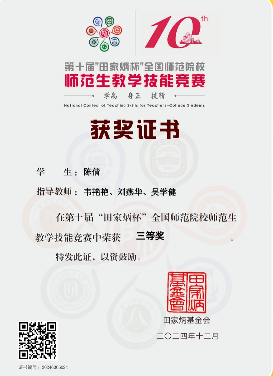 同样令人振奋的是,在第十届“田家炳杯”全国师范院校师范生教学技能竞赛中,我院2022级生物科学专业本科生陈倩在指导老师韦艳艳等老师的精心辅导与耐心指导下,教学功底愈发扎实,教学方法日益精进,最终凭借出色的表现荣获三等奖。