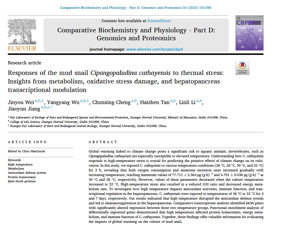 研究成果以“Responses of the mud snail Cipangopaludina cathayensis to thermal stress: Insights from metabolism, oxidative stress damage, and hepatopancreas transcriptional modulation”为题,发表于国际学术期刊Comp. Biochem. Physiol. D(中科院二区)上,我院硕士研究生韦金友和吴扬扬为共同第一作者,蒋骄云副教授为论文通讯作者。研究得到了珍稀濒危动植物生态与环境保护教育部重点实验室(广西师范大学)和广西珍稀濒危动物生态学重点实验室得支持。
