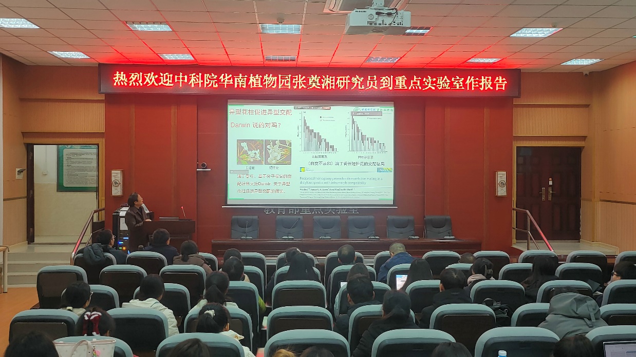 张奠湘研究员多年来主要从事植物系统与进化研究。在豆科、茜草科、水玉簪科等植物类群的分类与系统发育、热带植物的传粉机制与繁育系统进化研究等领域在国际国内学术界具有良好声誉。本次报告会,张老师以“异型花柱进化的生态与分子机制——达尔文经典科学问题的研究进展”为题,探讨植物异型花柱进化的生态与分子机制。