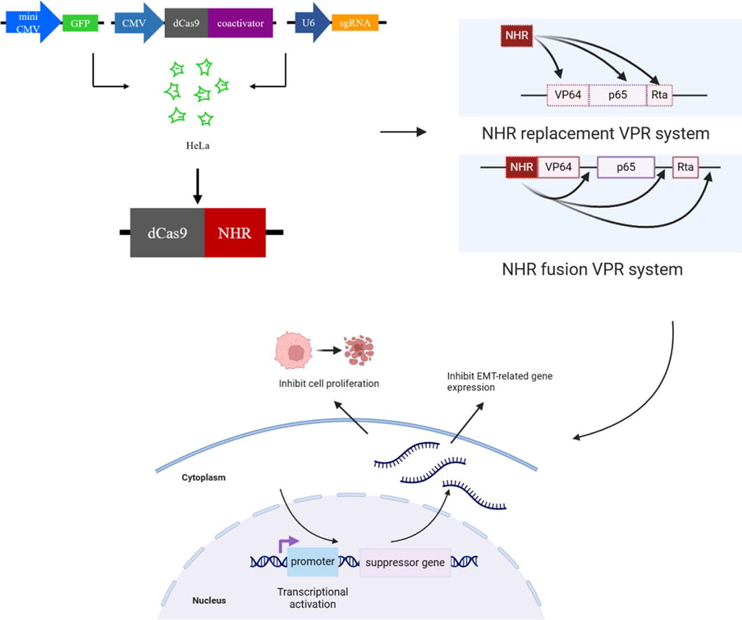 该研究团队首先从秀丽隐杆线虫(C. elegans)筛选出了NHR模块,发现其在转录激活能力上优于传统的VP64模块,且体积更为紧凑。研究人员通过将NHR模块与dCas9-VPR系统融合,进一步构建了一种称为NHR-VP64-p65-Rta(NVPR)的CRISPRa系统。该系统可使哺乳动物细胞中内源性基因激活的效率得到显著改善。RNA-seq分析显示,dCas9-NVPR复合物在全基因组范围内具有高特异性。最后,研究人员证明,dCas9-NVPR在恢复肿瘤抑制基因PER2和ZNF382的表达方面表现出色,能够有效抑制癌细胞的恶性表型。这项研究证实了基于CRISPR的精准治疗方法的巨大潜力,为未来基因治疗研究和临床应用开辟了新的道路。
