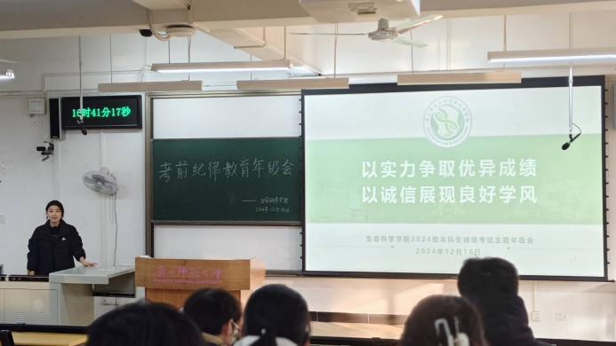 为营造风清气正的考试环境,培养学生诚实守信的道德品质,2024年12月16日—20日,生命科学学院各年级开展“以实力争取优异成绩、以诚信展现良好学风”诚信考试主题教育年级会。此次会议由学院各年级辅导员主持,全体本科生共同参与。