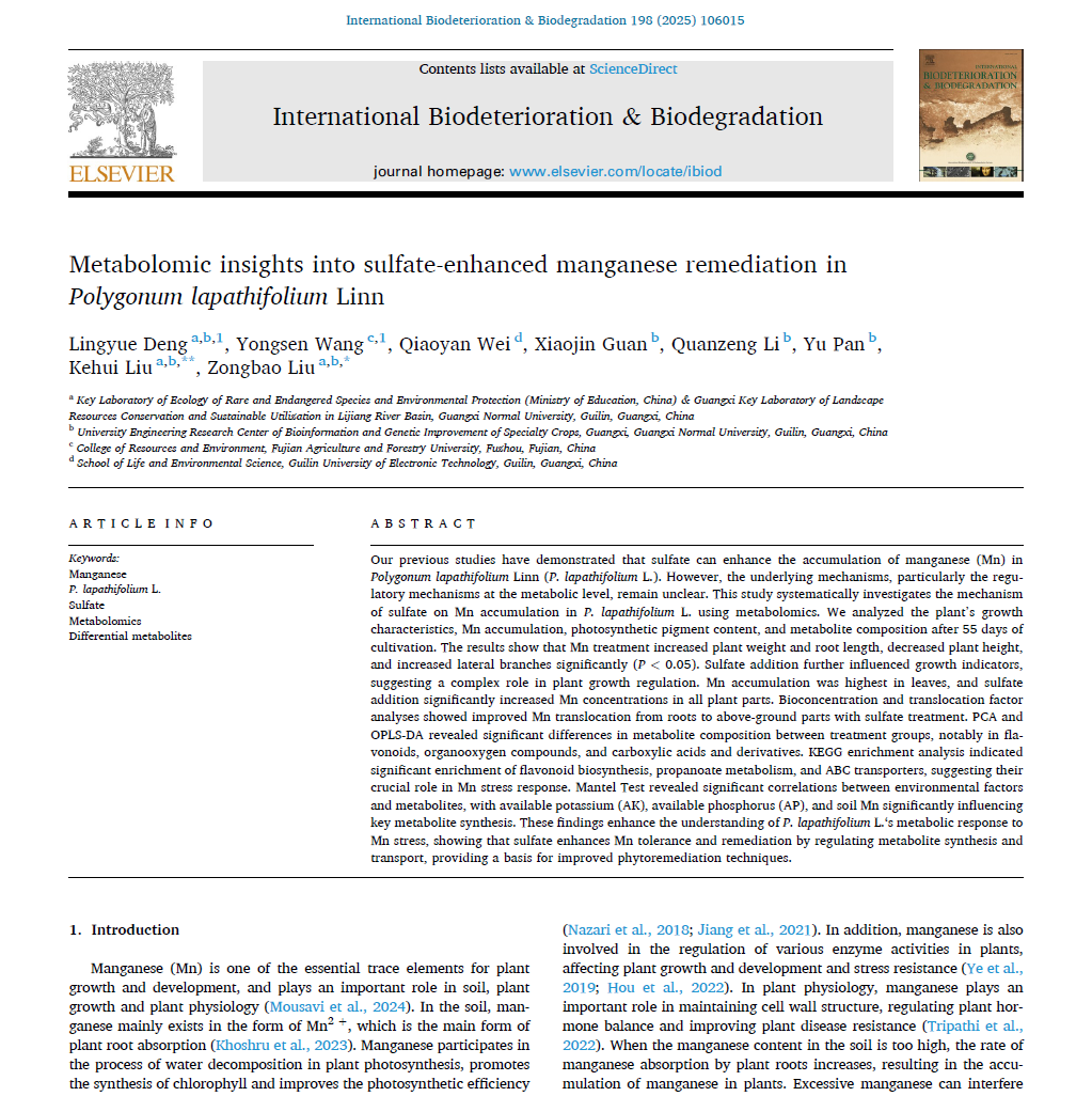 近日,刘宗保课题组在国际学术期刊《International Biodeterioration & Biodegradation》(中科院二区期刊,影响因子4.1)发表题为《Metabolomic Insights into Sulfate-Enhanced Manganese Remediation in Polygonum lapathifolium Linn》的研究论文。该研究揭示了硫酸盐如何通过调控植物代谢途径显著提升酸模叶蓼(Polygonum lapathifolium Linn)对锰污染土壤的修复效率,为植物修复技术的优化提供了重要理论依据。珍稀濒危动植物生态与环境保护教育部重点实验室&广西漓江流域景观资源保育与可持续利用重点实验室为该论文第一单位,2022级研究生邓灵玥为论文的第一作者,刘宗保副教授和刘可慧教授为通讯作者。