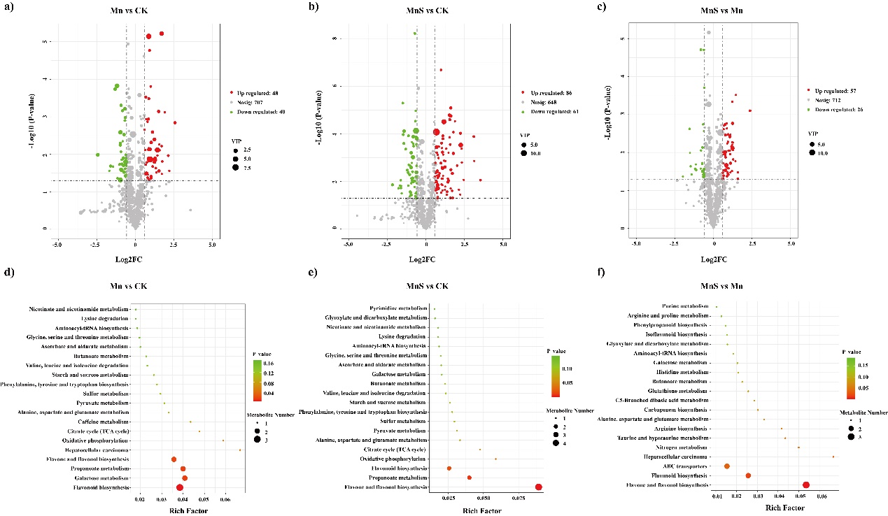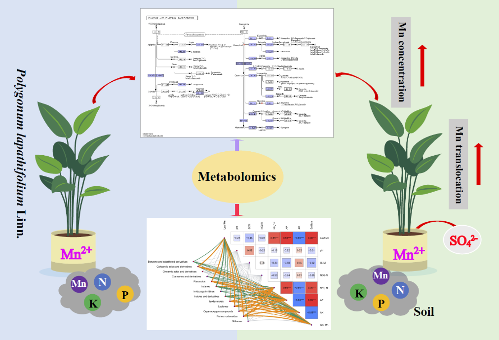 锰是植物必需的微量元素,但过量积累会破坏土壤生态并威胁人体健康。传统物理化学修复方法成本高且易造成二次污染,而植物修复技术因其绿色经济的特点备受关注。酸模叶蓼作为一种锰超富集植物,对高浓度锰环境具有强耐受性,但其修复效率提升机制尚不明确。研究团队通过55天的盆栽实验发现,硫酸盐处理显著提高了酸模叶蓼各部位的锰积累量,其中叶片锰浓度最高可达6480 mg·kg⁻¹,是普通毒性阈值的4.3倍。同时,硫酸盐促进了锰从根部向地上部分的转运效率,茎叶转运因子提升55%。另一方面,硫酸盐的添加也导致土壤酸化,增加锰的生物可利用性,间接抑制了植物生长指标(如株高和生物量)。通过非靶向代谢组学分析,研究团队发现硫酸盐显著改变了酸模叶蓼的代谢物组成。类黄酮、含氧有机物和羧酸类衍生物是差异代谢物的主要类别。其中,槲皮素、山奈酚等类黄酮化合物通过抗氧化和金属螯合作用缓解锰毒害;丙酸代谢和ABC转运蛋白通路的富集则表明植物通过能量代谢调整和离子转运增强锰耐受性。此外,土壤有效钾(AK)、有效磷(AP)和锰含量与代谢物合成显著相关,提示养分管理对修复效果的关键影响。