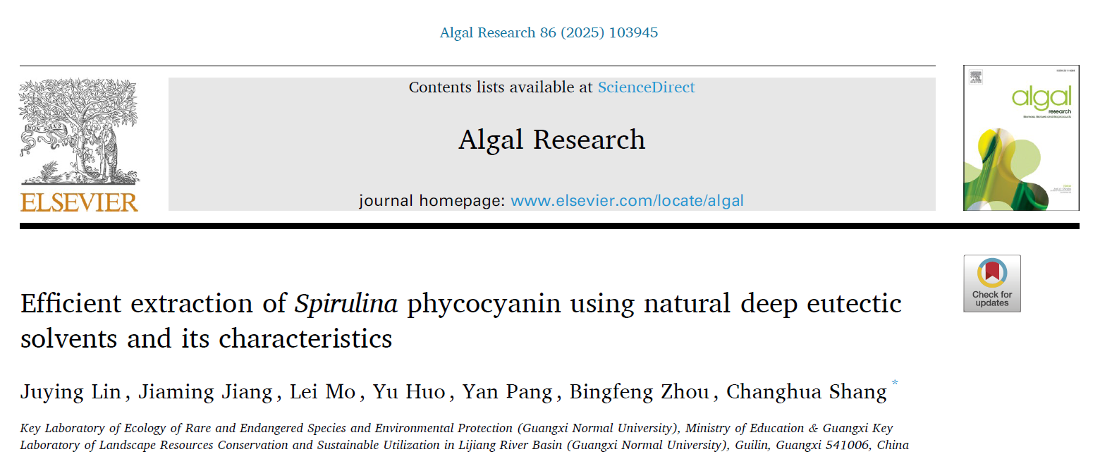 2025年2月4日,尚常花副教授课题组在国际学术期刊《Algal Research》在线发表题为“Efficient extraction of Spirulina phycocyanin using natural deep eutectic solvents and its characteristics”的最新研究成果。2023级生物学硕士研究生林菊英为第一作者,尚常花副教授为通讯作者。《Algal Research》是藻类学领域中科院2区期刊,IF=4.6。本论文得到广西自然科学基金项目(2024JJA130020)、广西重点研发计划项目(2023AB01132)及2024年度国家自然科学基金联合培育项目(2024PY020)的资助。