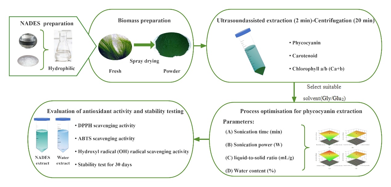 本研究基于NADES和超声波辅助提取藻蓝蛋白,以喷雾干燥法制备的螺旋藻粉为原料,使用NADES为提取溶剂,进行藻蓝蛋白的提取。同时,比较了NADES提取物和水提取物的抗氧化活性。NADES提取物也表现出较强的抗氧化活性。对NADES提取物与水提取物进行稳定性测试,结果表明NADES显著提高了藻蓝蛋白的稳定性。本研究提供了一种高效、经济且环保的提取方法,为大规模生产藻蓝蛋白及其在食品和化妆品中的应用奠定了良好的基础。