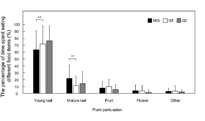 白头叶猴(Trachypithecus leucocephalus)作为中国特有的濒危物种(CR),主要生活在由雄性领导的两性群体中,雄性离群后可能加入全雄性群体,待时机成熟挑战接管两性群体。本研究通过对比白头叶猴全雄性群体(MG)与两性群体(G1、G2)在觅食行为、时间分配及活动范围上的差异发现:MG、G1和G2食物组成相似,以叶子为主,但种类和偏好有差异;时间预算方面,三者活动分配相似,主要行为(包括休息、移动、觅食和理毛)无显著差异;然而,MG中成年雄性相较于G1觅食和理毛时间更多,休息少,与G2则无显著差异;家域范围方面,MG涉足样方数最多但范围稳定,G1和G2边界明确,三群体均偏好特定小区域,MG与G2重叠度低。总体而言,白头叶猴的全雄性群体与无重叠家域范围的两性群体在行为上存在差异,表明在觅食、竞争风险和繁殖机会间的权衡可能决定了其生活在全雄性群体中的行为策略。这项研究不仅为理解白头叶猴的生态适应策略提供了新视角,也为制定有效的保护措施提供了科学依据。