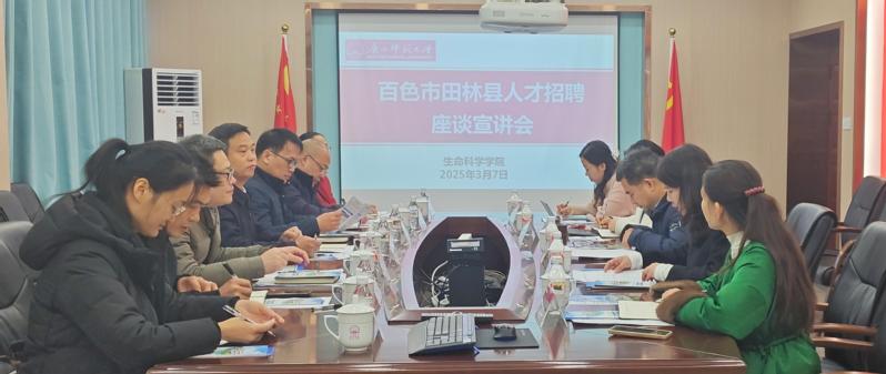 宣讲会前,生命科学学院与田林县人才招聘工作组就毕业生就业和校地合作等方面进行交流座谈。学院行政主要负责人详细介绍了生命科学学院的基本情况、专业设置、人才培养和近年来事业发展取得的优异成绩。田林县副县长付小文同志对田林县基本情况、人才引进政策及招聘岗位需求等内容作介绍。会上,双方明确表达了加强交流合作、推动共同发展的良好愿望,还就相关领域合作进行了深入交流。