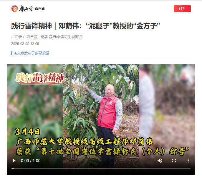 3月9日,广西云以《践行雷锋精神|邓荫伟:“泥腿子”教授的“金方子”》为文章题目,关注报道我院教授级高级工程师邓荫伟同志先进事迹。