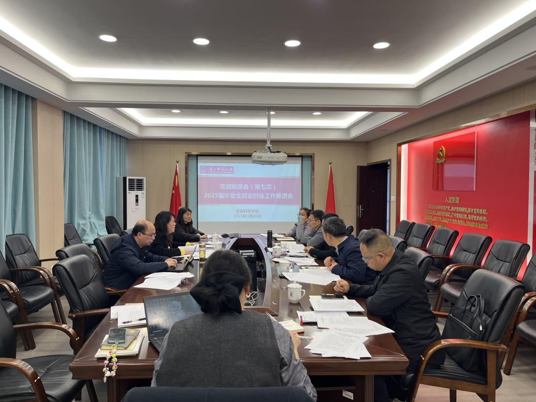 为抓紧就业工作关键期,全力聚焦毕业生就业难题,积极谋划就业工作新思路与新举措,全力促进2025届毕业生高质量充分就业,3月10日,生命科学学院召开党政联席会议,专题研究、部署推进学院2025届毕业生就业创业工作。学院党政领导班子参加会议,毕业班专职辅导员和教学秘书列席会议。会议由学院行政主要负责同志主持。