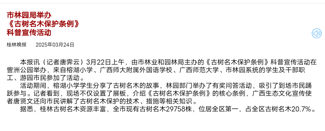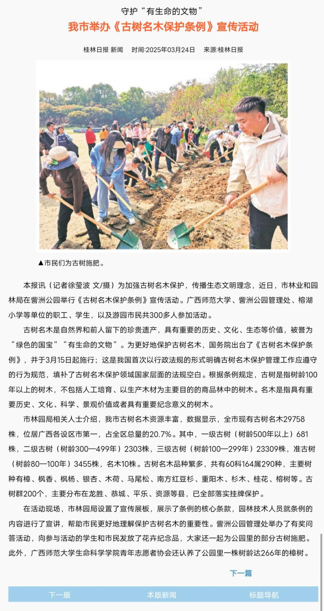 近日,【桂林日报】【桂林晚报】【桂林广播电视台】关注报道生命科学学院志愿者参与《古树名木保护条例》科普宣传活动。生命科学学院志愿者积极响应,踊跃参与到古树保护行动中来。他们不仅认养了园内的古树,还亲自动手为古树施肥,以实际行动诠释对自然的关爱。活动结束后,志愿者们纷纷表示,日后将持续开展宣传活动,向更多人普及保护古树的方法和意义。