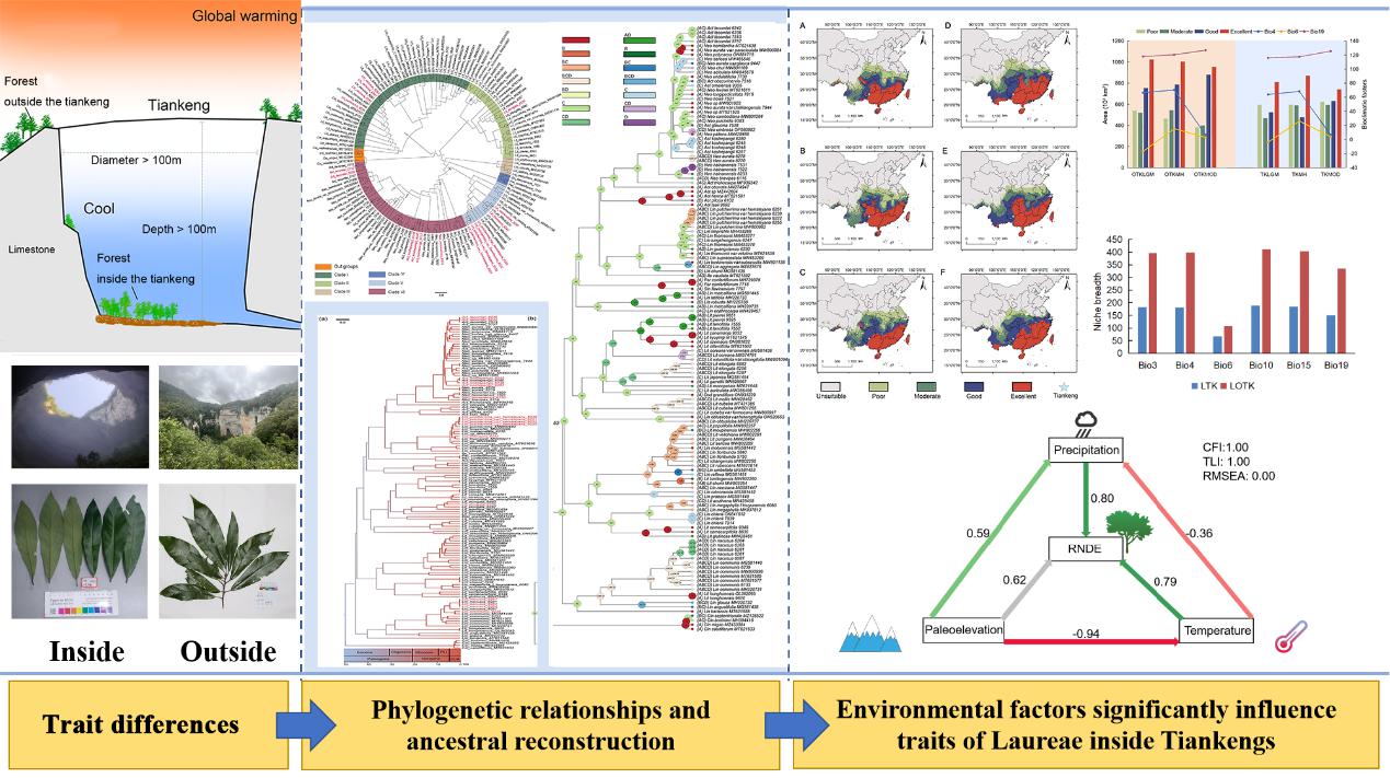 研究发现,青藏高原隆升显著影响了华南地区气候,进而塑造了樟科植物的性状特征。而天坑内樟科植物表现出弱系统发育信号,表明环境因素在驱动性状变异中起主导作用。与周边种群相比,天坑内樟科植物叶片长宽比显著减小,这种形态特征使其对天坑内较冷的生存环境具有更强的适应能力并占据有利的生态位。