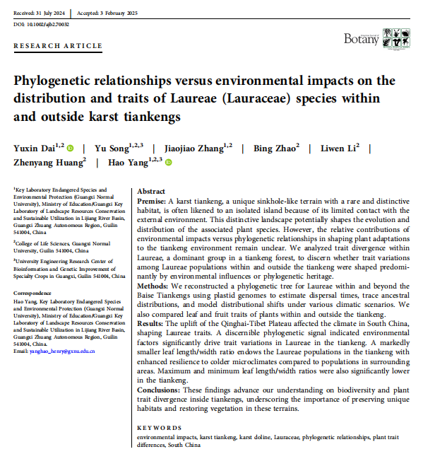 该研究成果以题为“Phylogenetic relationships versus environmental impacts on the distribution and traits of Laureae (Lauraceae) species within and outside karst tiankengs”在美国植物学会会刊American Journal of Botany (中科院二区,IF=2.4)发表。论文第一单位为广西师范大学珍稀濒危动植物生态与环境保护教育部重点实验室,我院2022级生态学研究生戴雨昕和宋钰教授为论文共同第一作者,杨皓副教授为通讯作者。该研究工作得到广西科技基地和人才专项 (Grant No.GUIKEAD21220093 & 2022AC20002) 和国家自然科学基金项目 (32460267) 的共同资助。