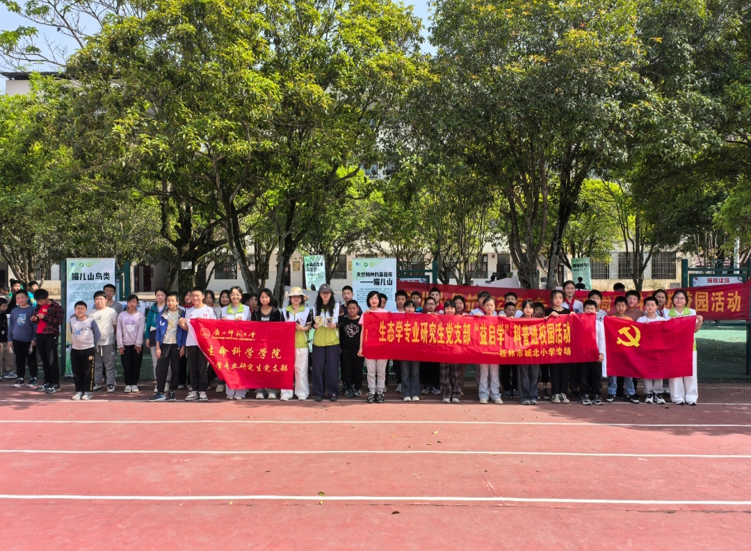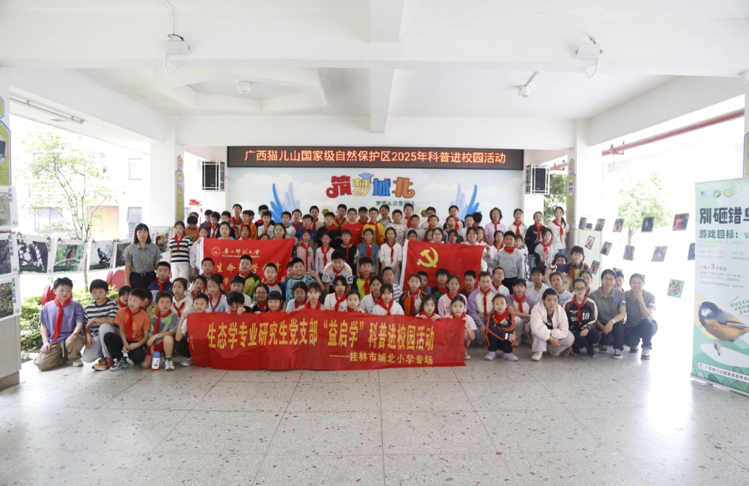 近日,生态学专业研究生党支部联合广西猫儿山国家级自然保护区管理处、广西翼界科技有限公司,分别前往桂林市城北小学、兴安县华江乡华江中心小学和兴安县第一小学三所学校开展“探秘猫儿山飞羽精灵,守护绿水青山”科普进校园活动。此次科普活动以鸟类保护为主题,通过知识传播与互动体验等形式展开,吸引千余名师生热情参与。
