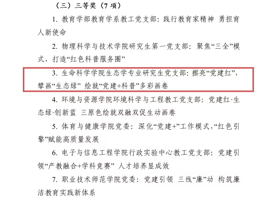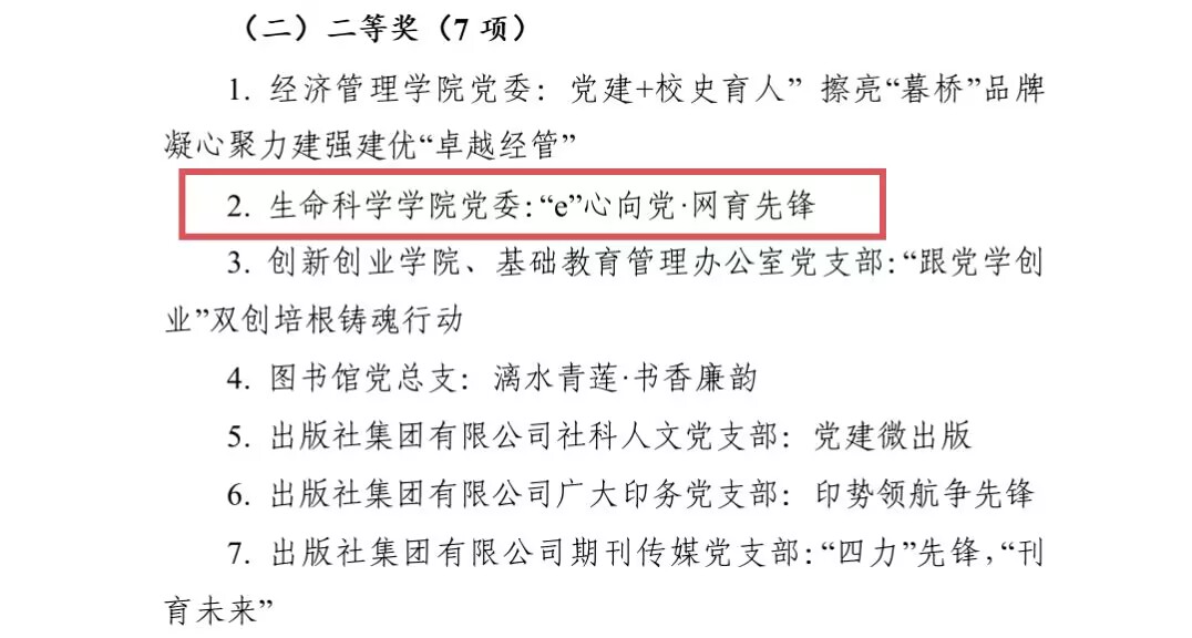 近日,学校党委《关于公布学校党建案例和党建品牌评选结果的通知》公布,我院党委推荐报送的党建品牌《“e”心向党·网育先锋》荣获二等奖,生态学专业研究生党支部的党建案例《擦亮“党建红”,摹画“生态绿”绘就“党建+科普”多彩画卷》荣获三等奖。