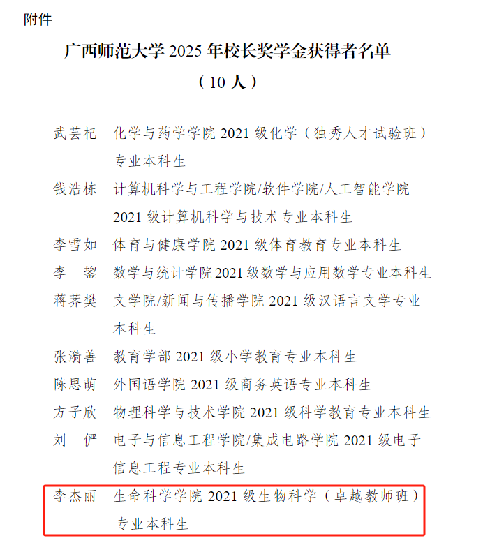 【喜报】我院本科生李杰丽荣获广西师范大学2025年校长奖学金