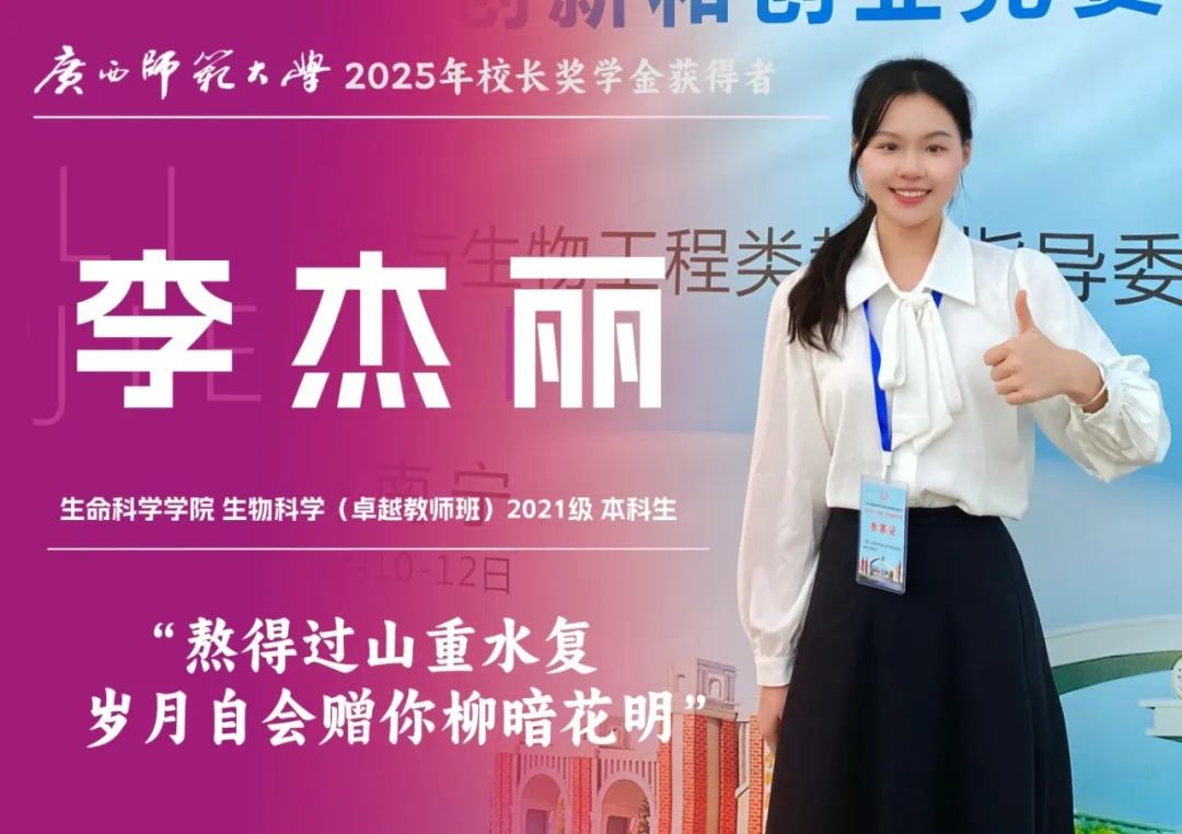 近日,广西师范大学2025年校长奖学金答辩会在育才校区隆重举行。经过学生个人申请、学院审核推荐、学校资格审查、竞争性答辩、公示等环节,评选出10名校长奖学金获得者。我院2021级生物科学(卓越教师班)本科生李杰丽在20名校长奖学金候选人中脱颖而出,荣获广西师范大学2025年校长奖学金。