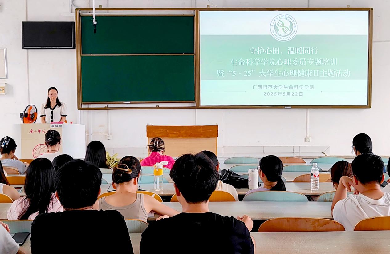在“5·25”全国大学生心理健康日来临之际,为加强学生心理健康教育,提升朋辈心理支持队伍的专业素养,生命科学学院于5月22日在雁山校区文四301教室举办“守护心田,温暖同行”心理委员专题培训暨“5·25”大学生心理健康日主题活动。学院专兼职辅导员代表、各班心理委员、各班宿舍长共计150余人参加活动。学校大学生心理健康教育中心刘曦瞳老师受邀为我院学生作心理健康主题讲座。