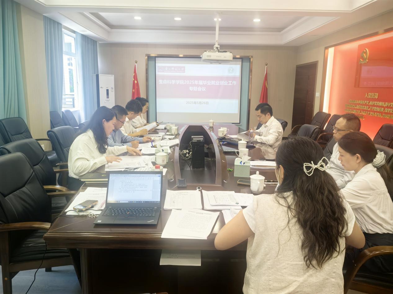为积极抢抓就业百日冲刺关键期,全力保障2025届毕业生高质量充分就业,5月26日,生命科学学院在雁山校区理科组团224会议室召开2025届毕业生就业创业工作专题会议,学习学校2025届毕业生就业工作推进会会议精神,研究贯彻落实措施。学院党政领导班子、毕业班辅导员参加会议。