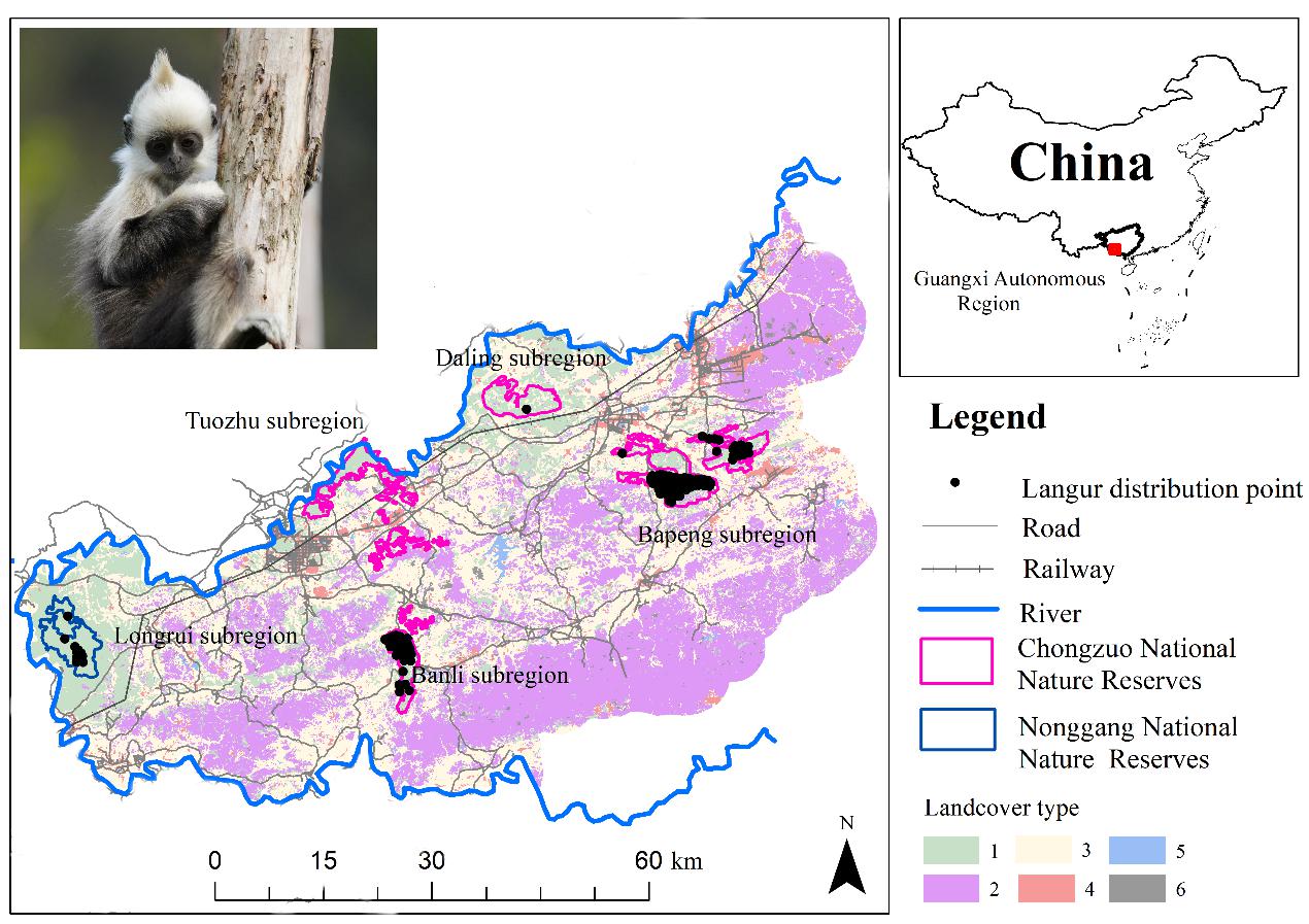 图1. 白头叶猴分布区域展示,土地覆盖类型:1、天然林;2、桉树;3、农用地;4、城镇;5、水体;6、道路
