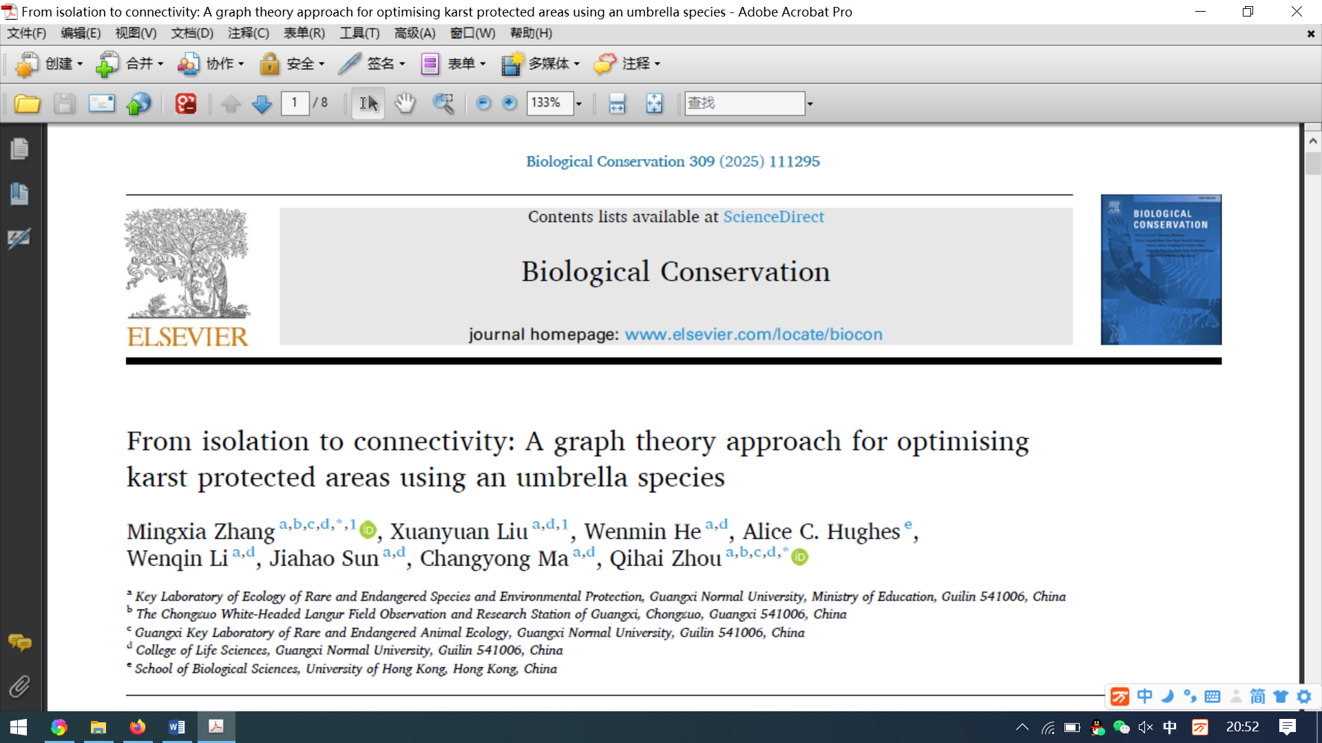 该项研究结果以“From isolation to connectivity: A graph theory approach for optimising karst protected areas using an umbrella species”在保护生物学经典期刊Biological Conservation发表。论文第一单位为广西师范大学珍稀濒危动植物生态与环境保护教育部重点实验室,我院张明霞副教授和2021级生态学研究生刘宣园为论文共同第一作者,周岐海教授和张明霞副教授为论文共同通讯作者。该研究获得了国家自然科学基金项目 (32260329,32170492和32270504),和广西科技专项奖学金基金(Guike AD21220091)的资助。