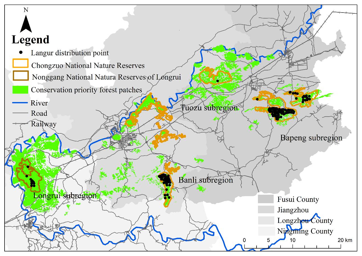 针对以上结果,我们建议当前优先对有白头叶猴分布的植被斑块进行保护和提升,并在未来,将全部298个关键斑块作为"其他有效区域保护措施(OECMs)"纳入现有保护体系中。这一综合保护方案不仅能显著改善白头叶猴栖息地的景观连通性,还将惠及喀斯特生态系统的其他特有物种,从而全面提升区域生态系统的功能连通性。