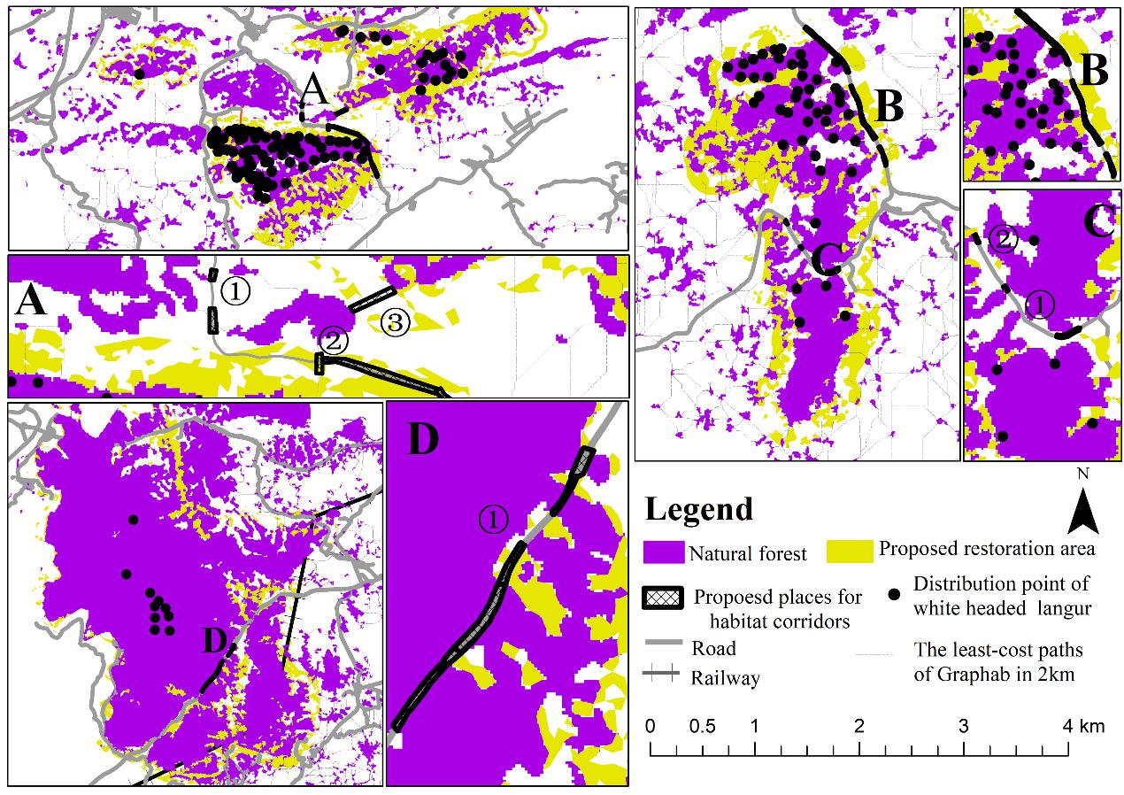 在本研究中,我们首先通过栖息地模型估算景观对白头叶猴迁移的阻力值,并结合野外观察获得的白头叶猴不同距离迁移概率,综合分析天然林斑块对栖息地景观连通性的贡献值,从而确定栖息地恢复的关键节点。随后,我们模拟了不同距离范围内人工林和农田转化为自然森林的情景,通过比较各情景下的连通性增量,明确了栖息地恢复的最优尺度。结果表明:在所有扩散距离条件下,298个总面积为590平方公里的森林斑块对景观连通性的贡献值均位列前10%,其中53个斑块(351平方公里)位于自然保护区内,11个斑块为白头叶猴现居地(图2);在600米缓冲区内实施生态恢复可使景观连通性提升13.3%,这一尺度被确定为最优恢复尺度。基于Graphab软件生成的最小成本路径,我们进一步围绕当前白头叶猴栖居的天然林斑块,制定了详细的栖息地恢复与廊道建设方案(图3)。