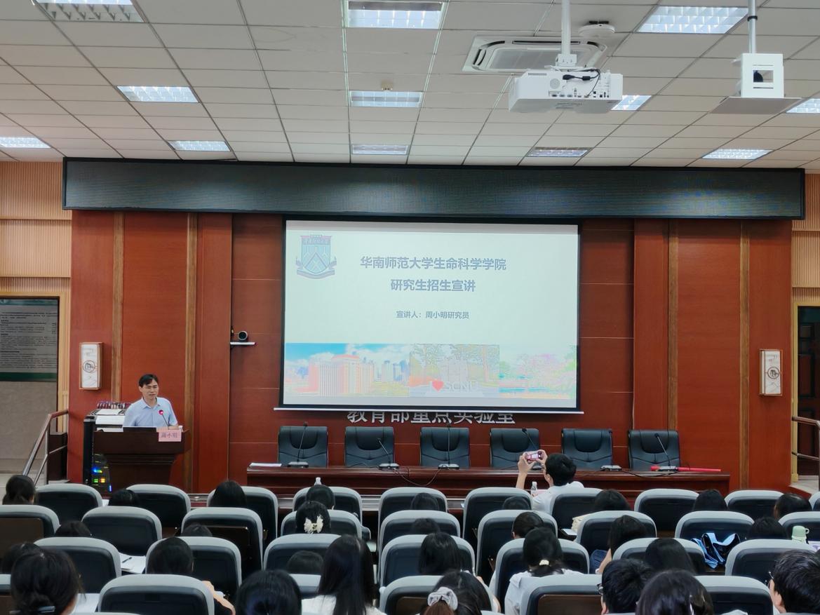 6月26日上午,华南师范大学生命科学学院研究员周小明、研究生院教师吕世涛一行到生命科学学院开展研究生招生宣传。2022级本科生辅导员、100余名本科生、研究生参加此次宣讲活动。