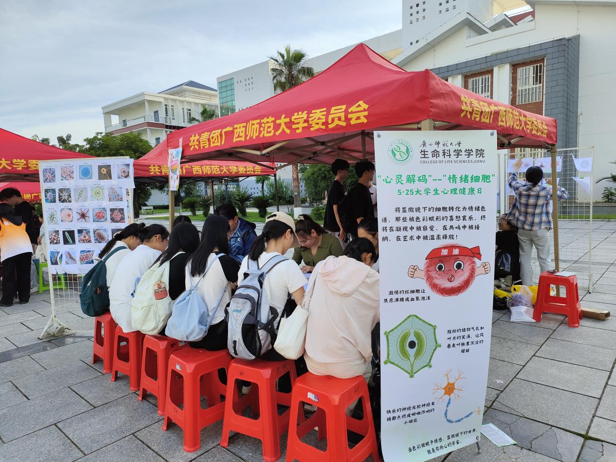 恰逢“5·25”全国大学生心理健康日,5月26日,由大学生心理健康教育中心及各学院联合开展的“心聚集市 润心同行”心理集市游园会在雁山校区孔子广场举办。其中,生命科学学院开展“心灵解码”—“情绪细胞”涂鸦墙活动。