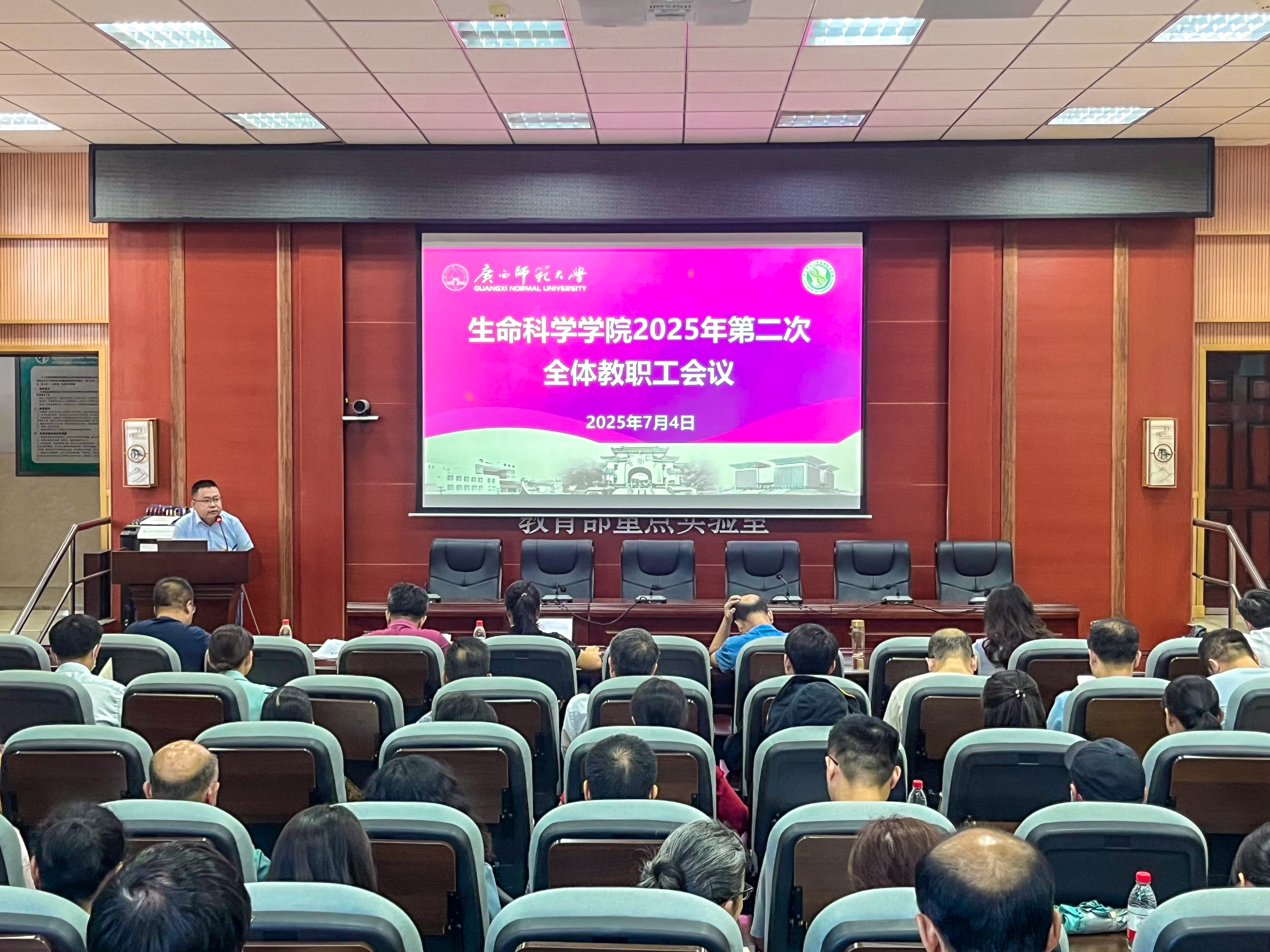 7月4日上午,生命科学学院在雁山校区伯康楼112报告厅召开2025年第二次全体教职工大会,传达学校第十二届党委五次全体(扩大)会议精神,总结上半年工作,部署暑假和下半年主要工作,通报2025届毕业生就业工作进展,统一思想、明确任务,凝聚全员就业合力,全力以赴做好 2025 届毕业生就业工作。会议由学院党委主要负责同志主持。