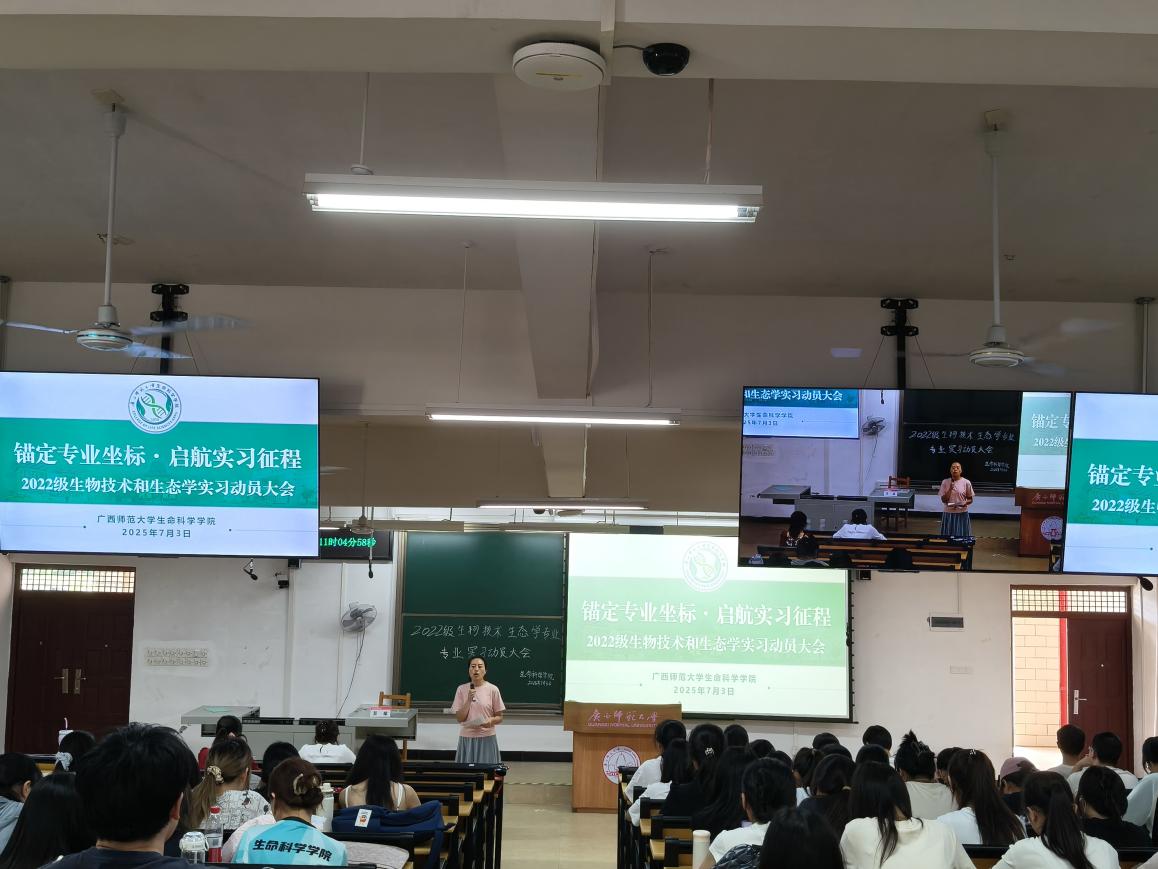 为深化实践育人体系建设,推动专业实习工作安全、有序开展,7月3日上午,生命科学学院2022级生物技术专业、生态学专业在雁山校区理科楼四区201教室召开专业实习动员大会。学院分管本科教学副院长,2022级专兼职辅导员,2022级生物技术专业、生态学专业全体学生参加实习动员大会。